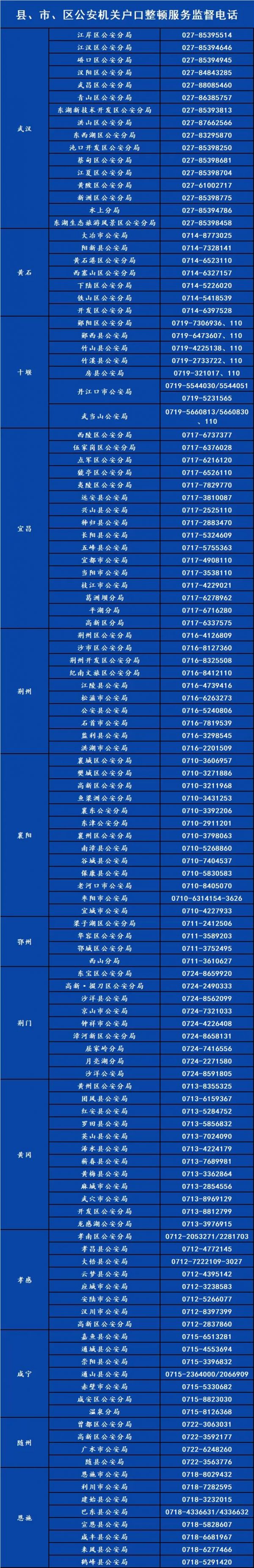 省公安厅服务监督电话:027-67122636,各市(州)、县(市、区)举报投诉方式附后。