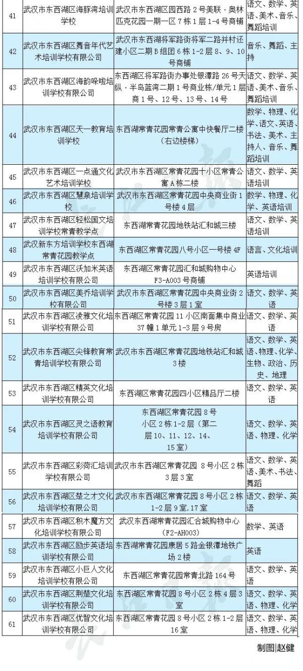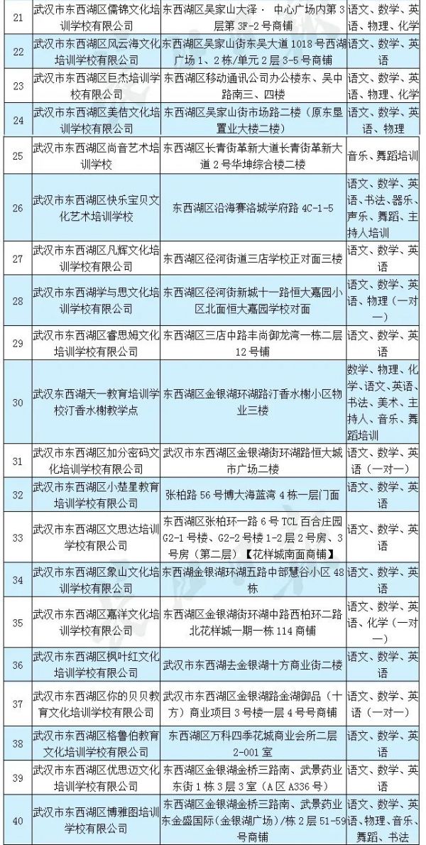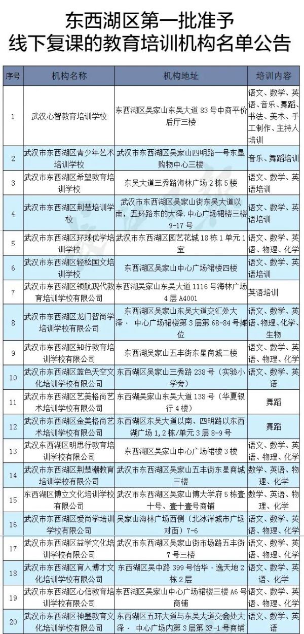 7月15日武汉市教育局公布汉阳区、武昌区、洪山区、东西湖区、黄陂区、新洲区、武汉开发区(汉南区)、东湖风景区准予线下复课的教育培训机构名单。快来看看东西湖区哪些教育培训机构可以线下开课了?
