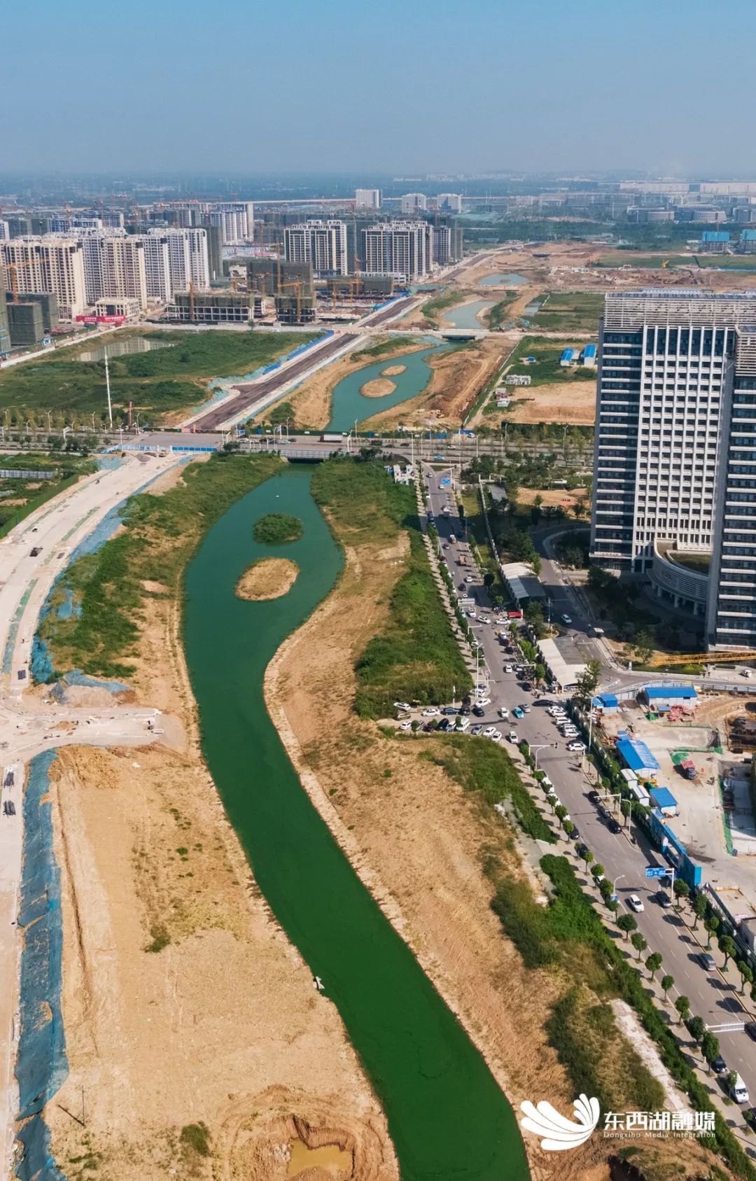 北岸国家网安基地,园林工人正在临空港大道沿线铺设草坪,颇具人文气息的郊野公园连通径河湿地;南岸临空港新城,东西湖中央明渠已现,挖掘机来回平整土地,樱花溪公园与周边市政配套设施建设同步进行中。