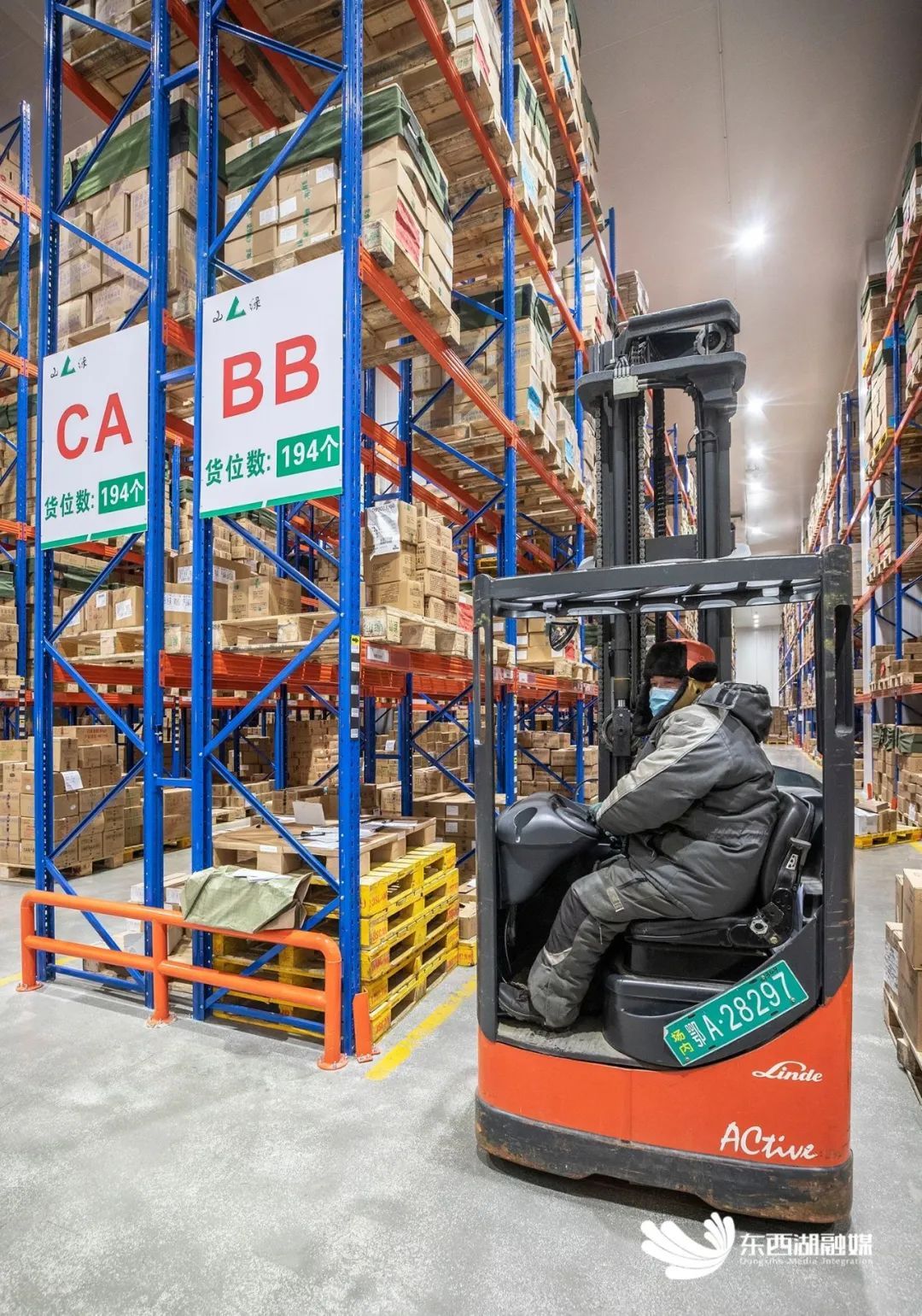 仓库外车辆川流不息、热火朝天,仓库内却是另一番景象,零下20℃的低温,让这里仿佛一个“超级冰箱”。