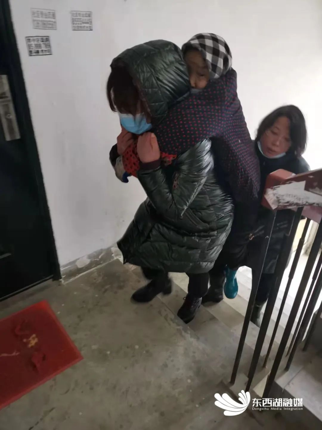 站起来后,熊婆婆感觉衣服湿透,而且腿脚无法用力,行走不便,叶莉等人就搀扶着她,慢慢挪到她所住的楼栋口。楼栋没有电梯,担心老人受凉,三位“女汉子”就轮流背起熊婆婆,一步一阶地上楼。进到家门时,三人都已累得气喘吁吁。