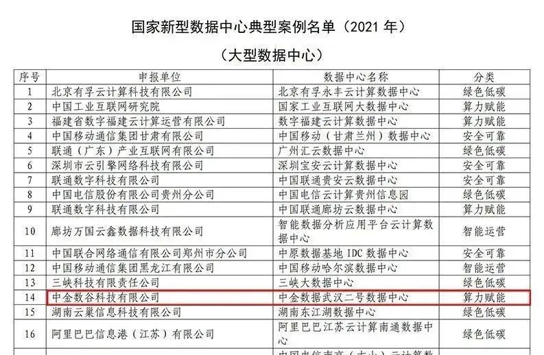 据介绍,来自全国范围的数百座数据中心参与了首批评选,经数据中心自评、省级各相关部门择优推荐、专家评审等层层环节,遴选出32个大型数据中心和12个边缘数据中心,中金数据武汉二号数据中心被评定算力赋能方向的大型数据中心典型案例。