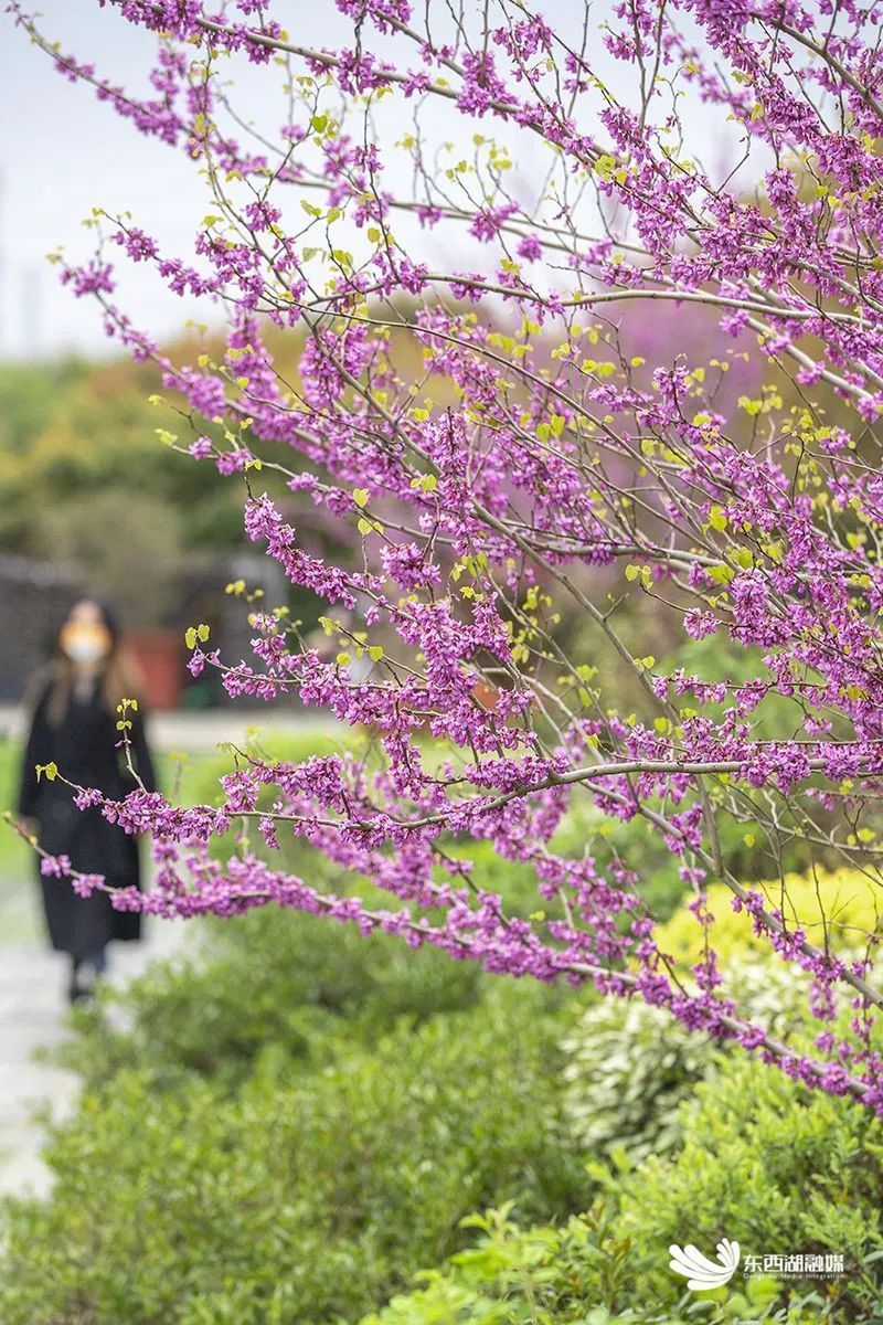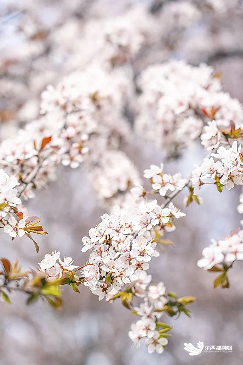 梅花落幕,细雨登场。金银湖绿道,紫叶李花团锦簇,遥看似雪。