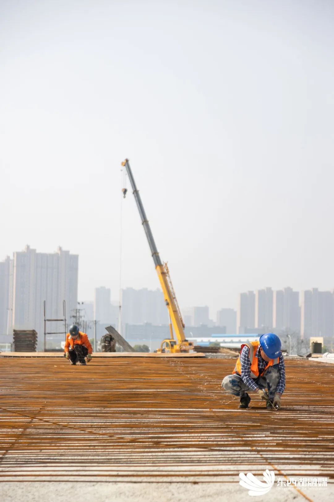 ▋工人们正在径河五路跨河桥桥面上铺设钢筋网。