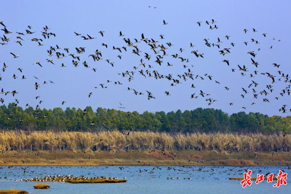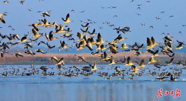 长江日报-长江网1月1日讯 连日来,武汉市东西湖区柏泉府河湿地,上万只候鸟在水面嬉水飞翔。据湿地保护区介绍,随着天气变化,由于加强湿地保护,护鸟志愿者24小时值守,前来越冬的候鸟不断增多,已成为市民观鸟、拍鸟、休闲度假的好去处。(通讯员郭贤乐 摄影报道)