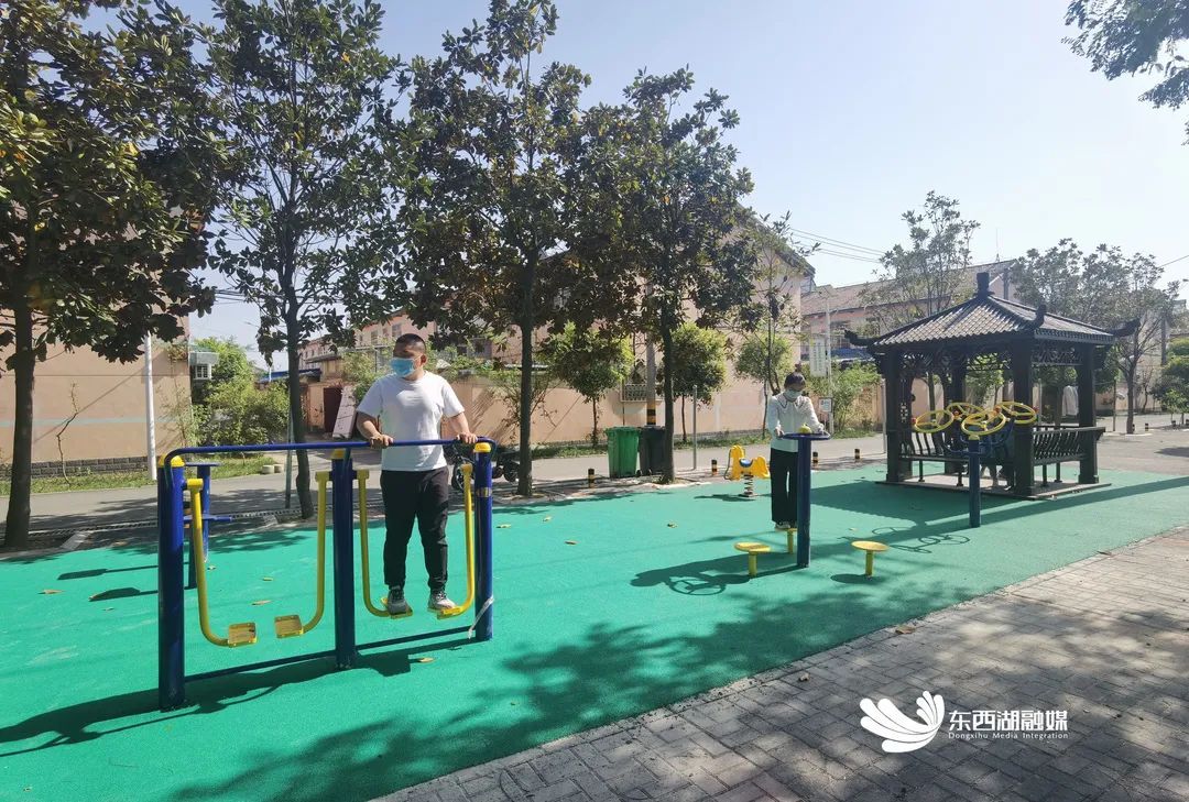我们来的时候,生活区只有住宅,你看现在这街道多么整洁,还配齐了健身器材,都是为我们老百姓办的实事好事。