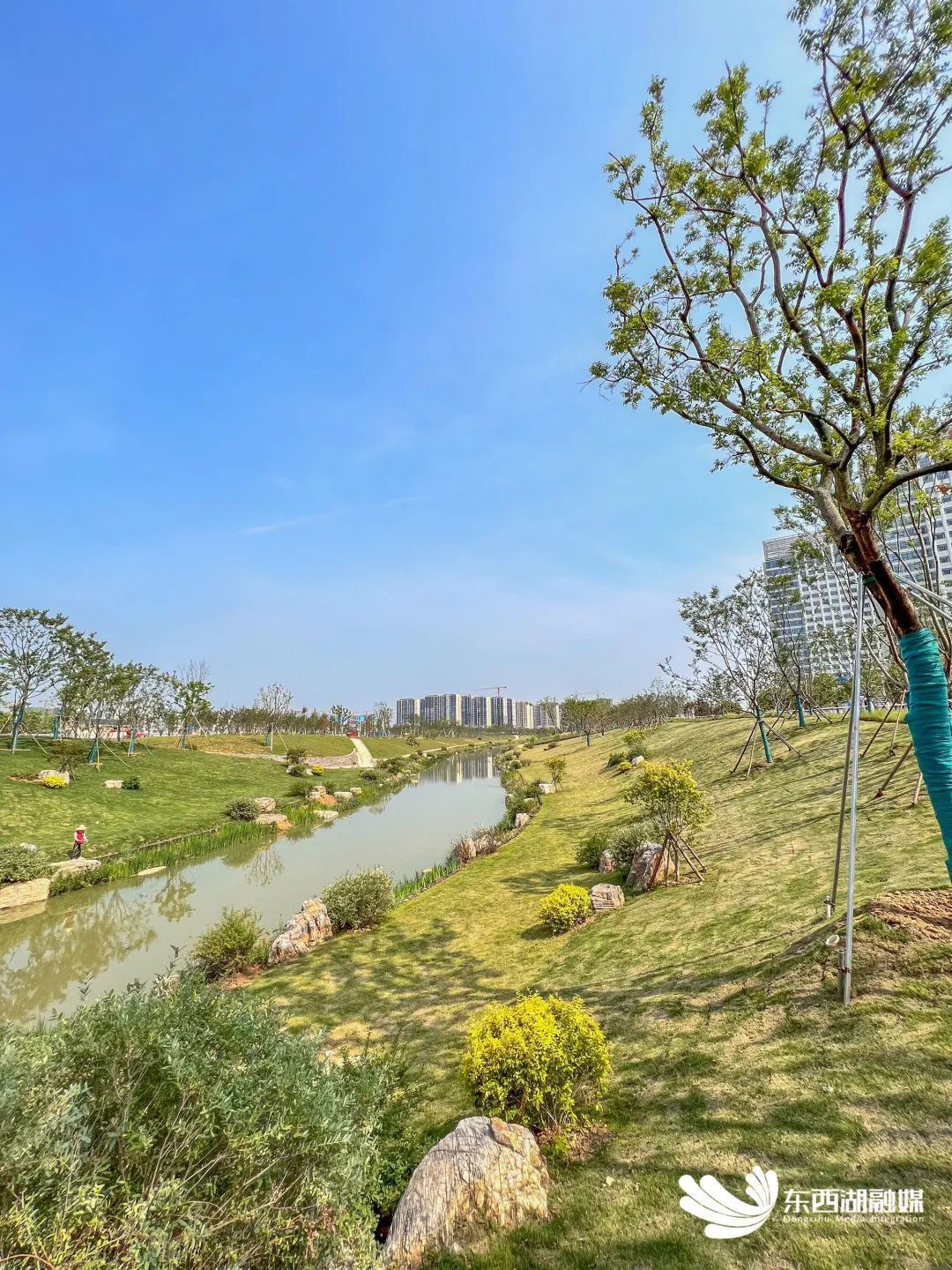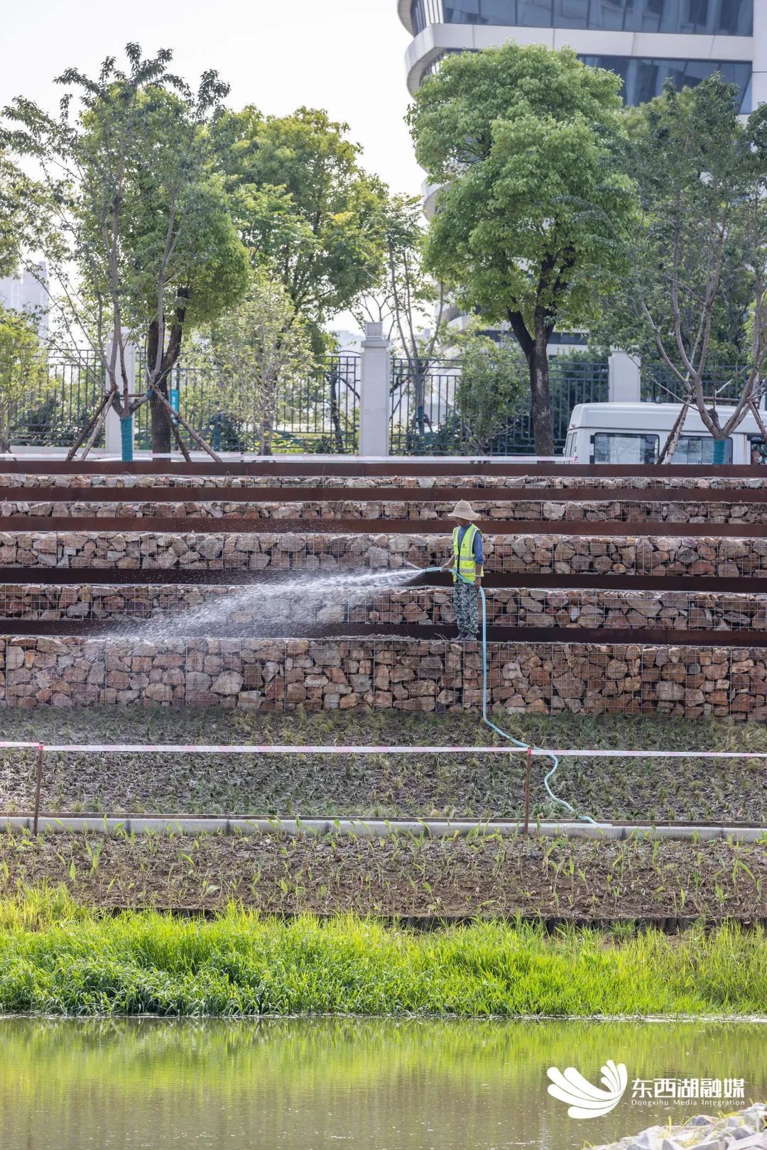 记者在现场看到,公园土建工程已全部完工、绿化景观已搭设完成,园林工人正在养护绿植花草。东岸观景平台设置的阶梯石椅,正在完善施工。
