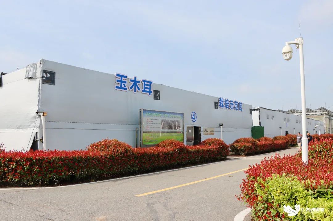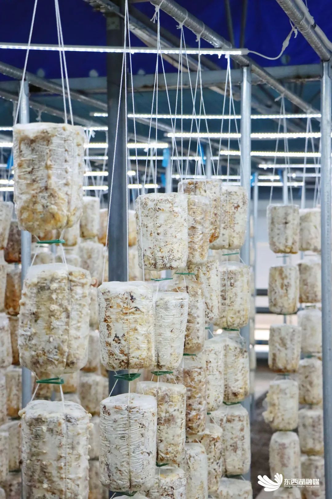 在东西湖食药用菌三产融合示范基地,一个个竖起来的圆柱形吊袋整齐排满整个玉木耳大棚。