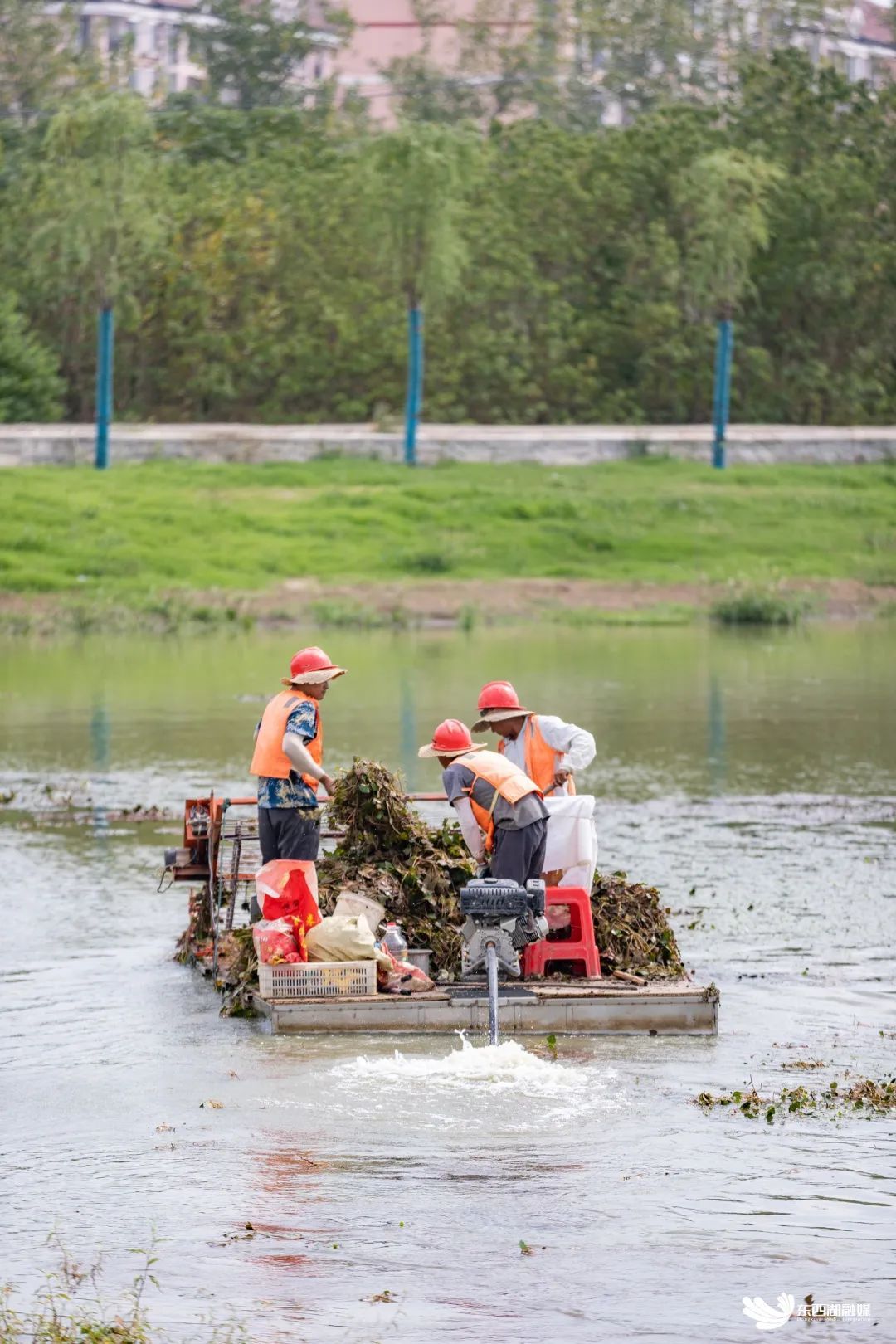水面清杂机在湖中心打捞浮萍水草