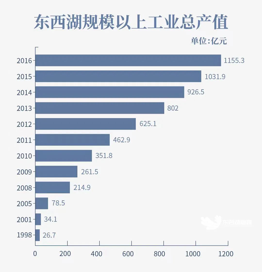 2016年东西湖区规模以上工业总产值已达到1155.3亿元,是2011年的2.5倍。