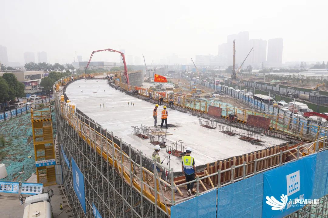 上午9时,在施工现场,泵车有序输送着混凝土,天泵挥动着“长臂”进行浇筑工作,各工序有条不紊地向前推进,随着最后一方混凝土浇入梁体,ES匝道首联箱梁顺利浇筑完成。
