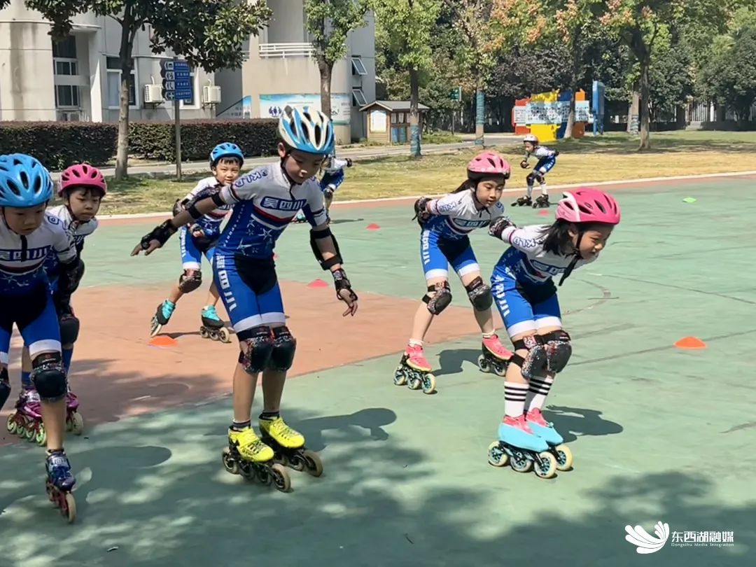 课间时分,吴家山第四小学篮球场上热闹非凡,小学生们在轮滑训练中相互比拼、相互学习。