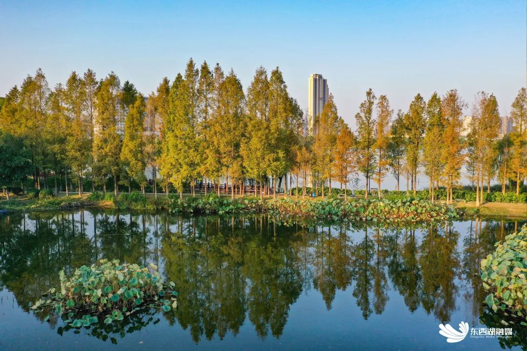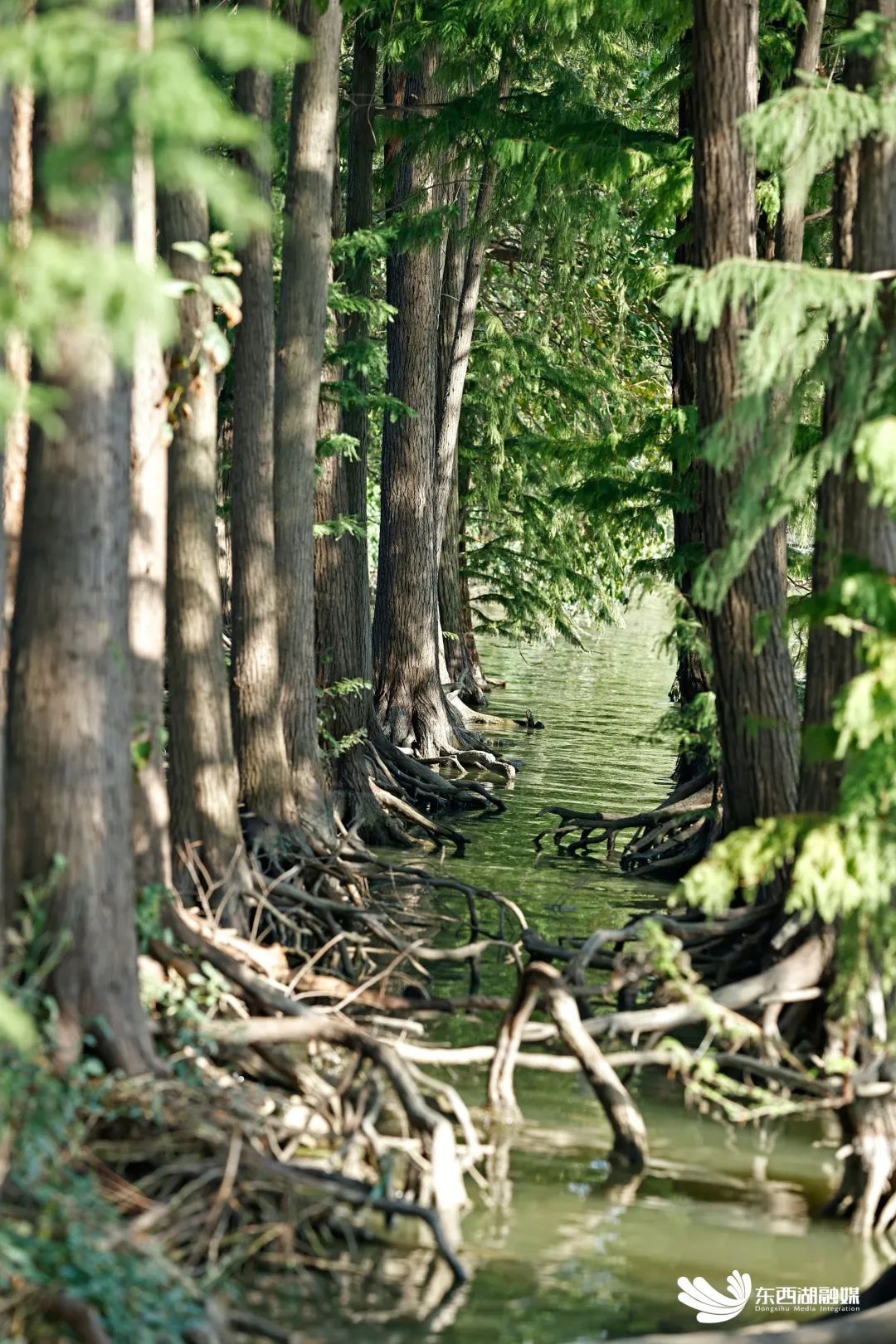 漂亮高大的杉科植物,除了颜值迷人的小确幸外还有调节径流,改善水质,调节小气候的作用。在呼吸根下生活着不计其数的水生植物、鱼类和昆虫也使得这片湿地拥有着如此完好的自然原生态。