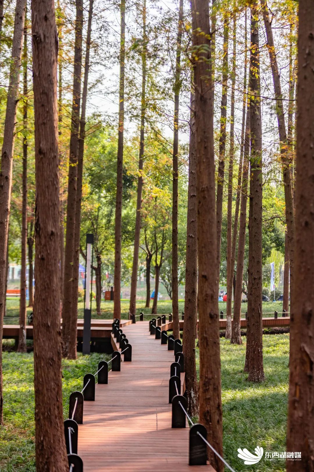 林下栈道曲折回环,滨水区设置沿湖步道,观湖平台及休憩场地,形成可观、可赏、可驻的滨水景观空间。绕湖散步,只见绚烂色彩与粼粼波光交相辉映,仿佛闯入森林秘境。