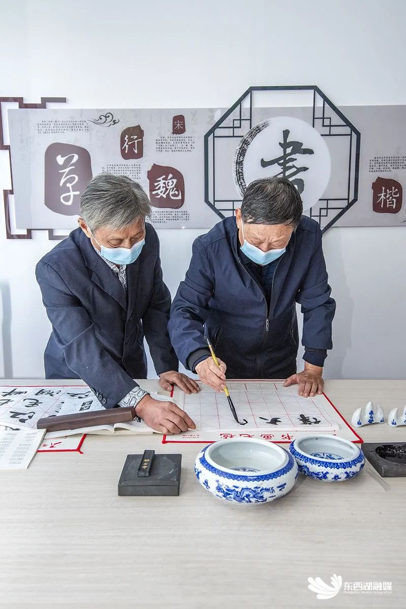杨克贵(左)与老哥们在老年活动室习练书法。