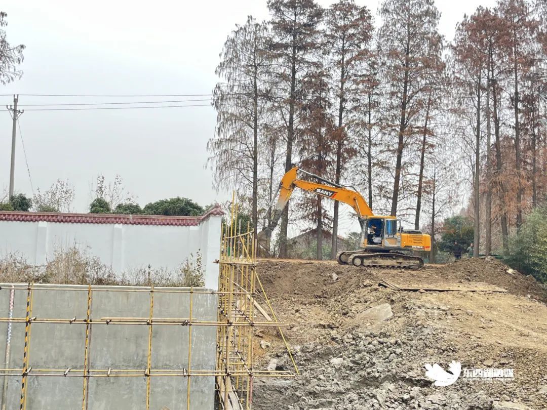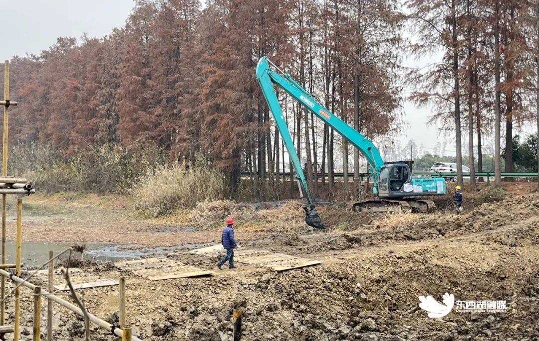 挖机正在对河岸、河堤进行培土修复、拓宽加固