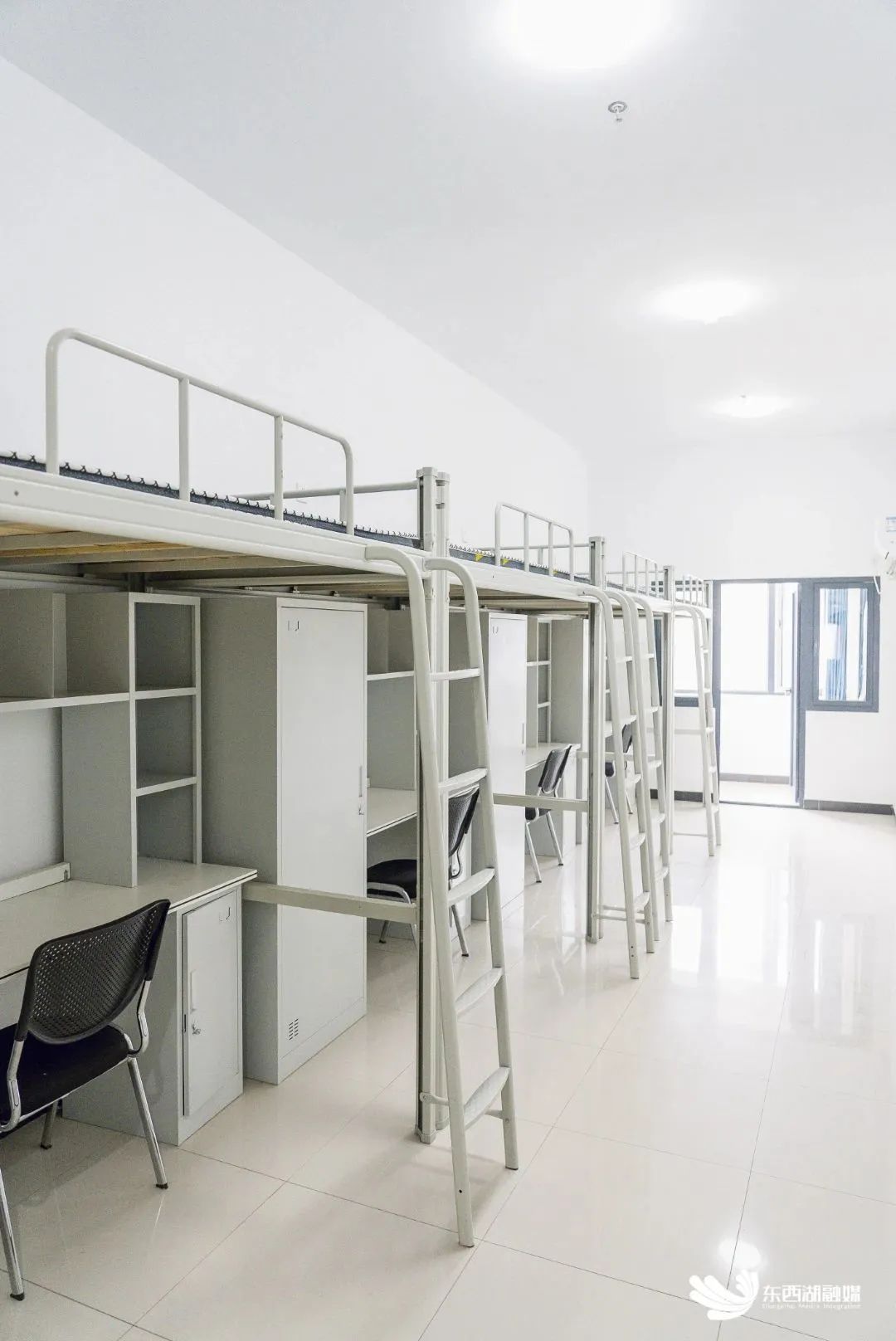 记者走进三人间,房间设置有独立卫生间、阳台、洗漱台,上床下桌的设计满足日常办公,一个床位价格为300元/月。