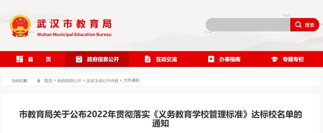 1月10日,武汉市教育局发布《市教育局关于公布2022年贯彻落实<义务教育学校管理标准>达标校名单的通知》。经委托第三方检查考评,认定市第六初级中学等199所学校为贯彻落实《义务教育学校管理标准》达标校。