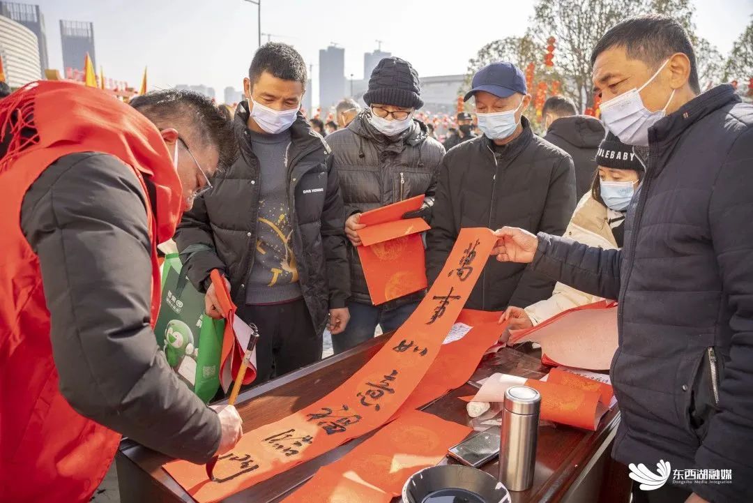 纯白建筑群下,“晒”着一副副火红的对联。“龙腾虎跃中国美,鸟语花香天下安。”书法家面前排起了长队。
