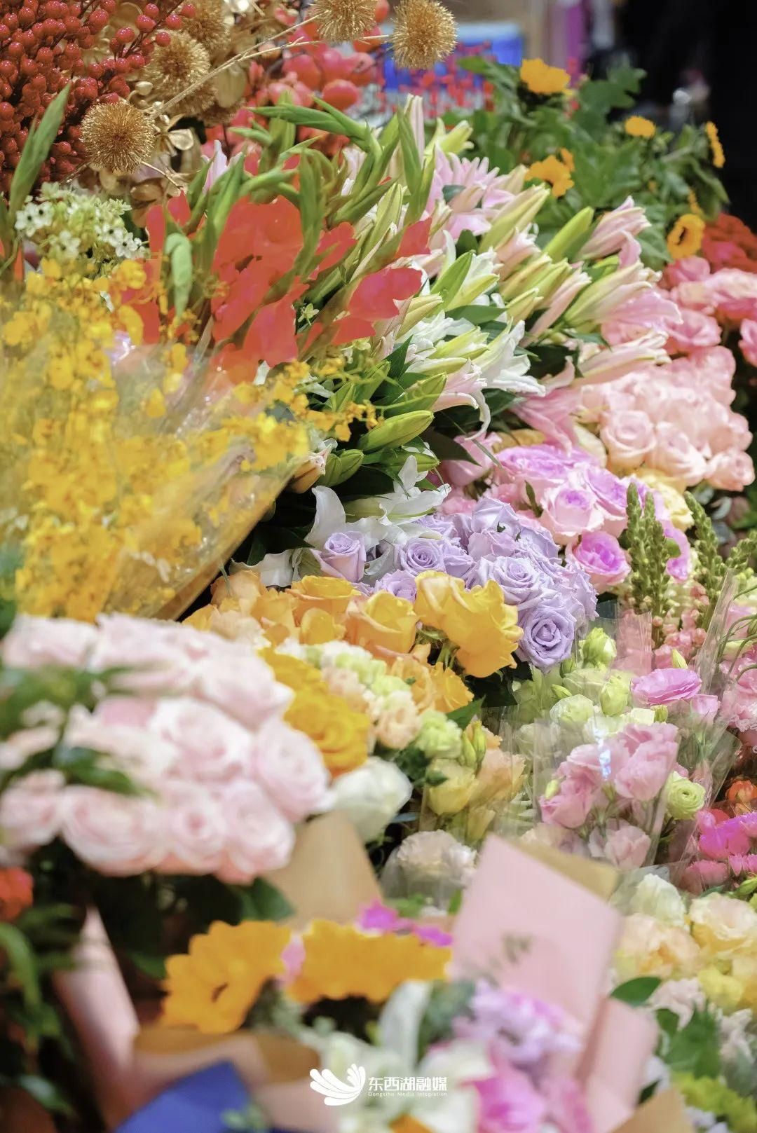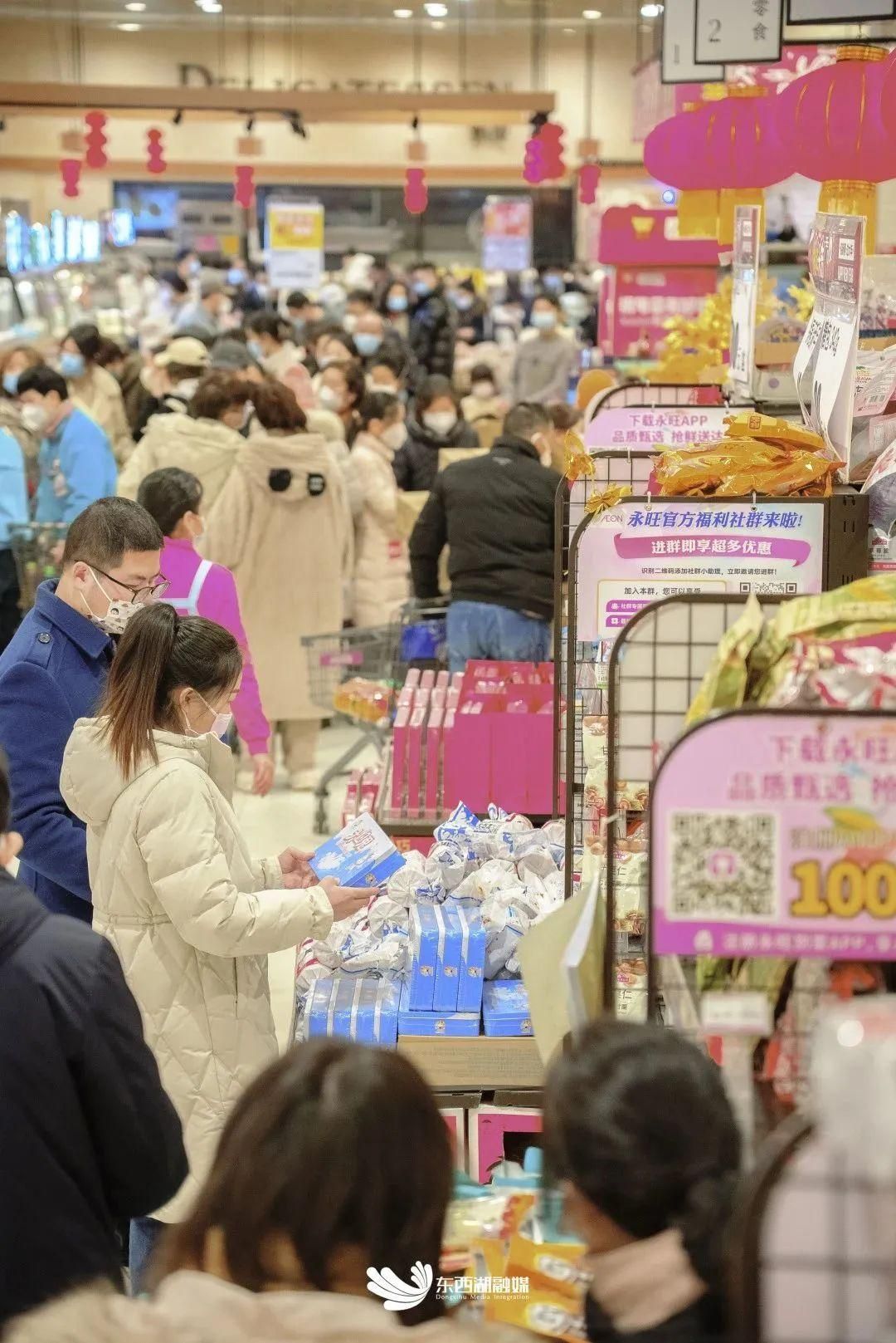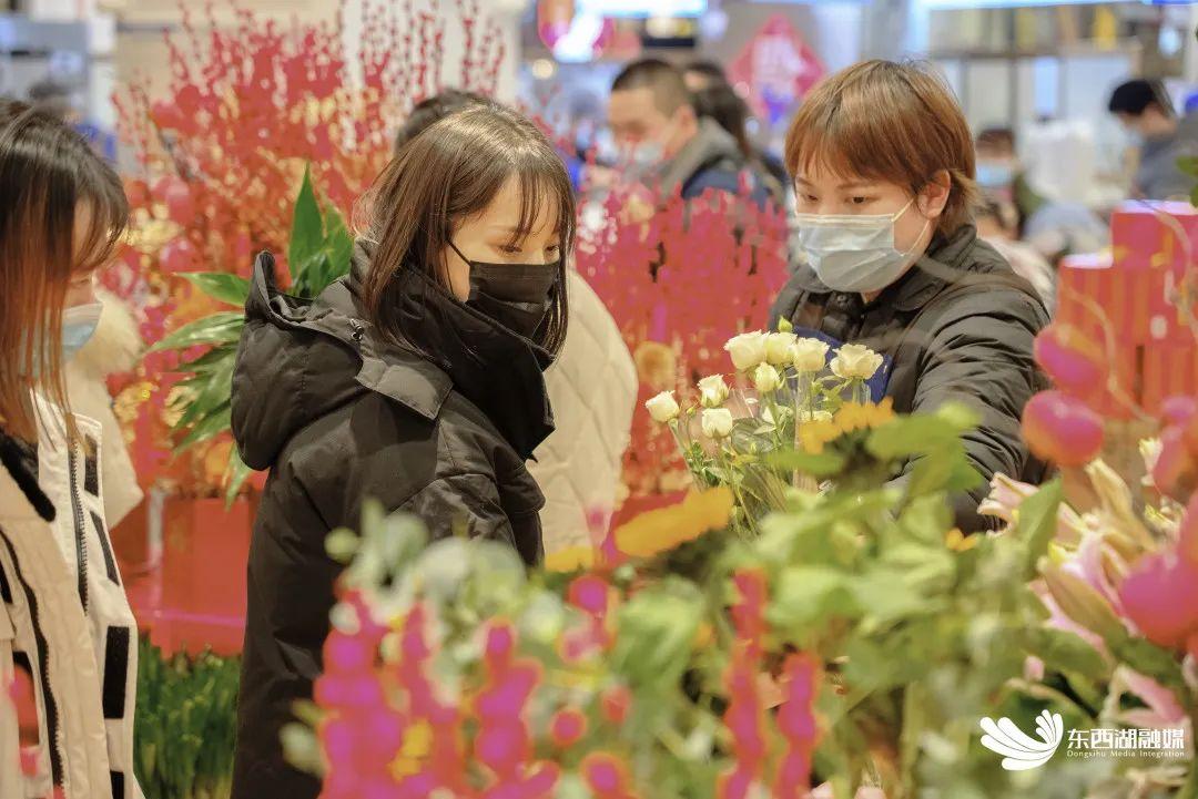而同一天,在一楼的永旺超市里也是摩肩接踵、人潮如织。记者在超市入口的鲜花区看到不少市民正在选购鲜花,要求包装精美,郁金香、百合和多头玫瑰都是热门选择。进入超市后,映入眼帘的就是大片摆放好的礼盒区,坚果、牛奶、零食等礼盒颇受欢迎。