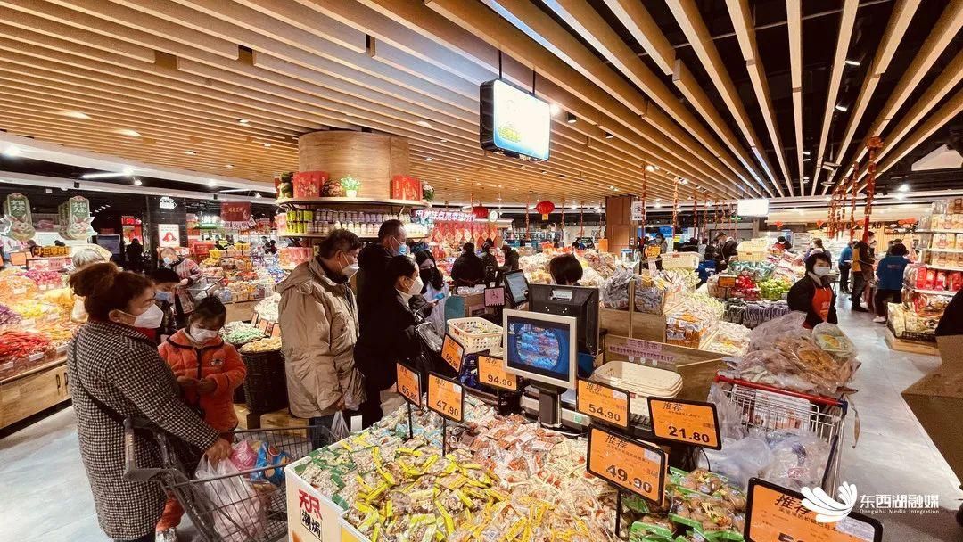 家住常青花园二社区的冯先生正把一箱牛奶放进推车内,妻子则抱着孩子在一旁选择糕点礼盒。冯先生告诉记者,他们一家三口正准备去亲戚家拜年,考虑到亲戚家有一个上小学的孩子和一位上年纪的老人,他们购买拜年礼品的方向大多考虑这两个年龄段的口味,“超市就在家门口,我们现在买完就直接去拜年,很方便。”