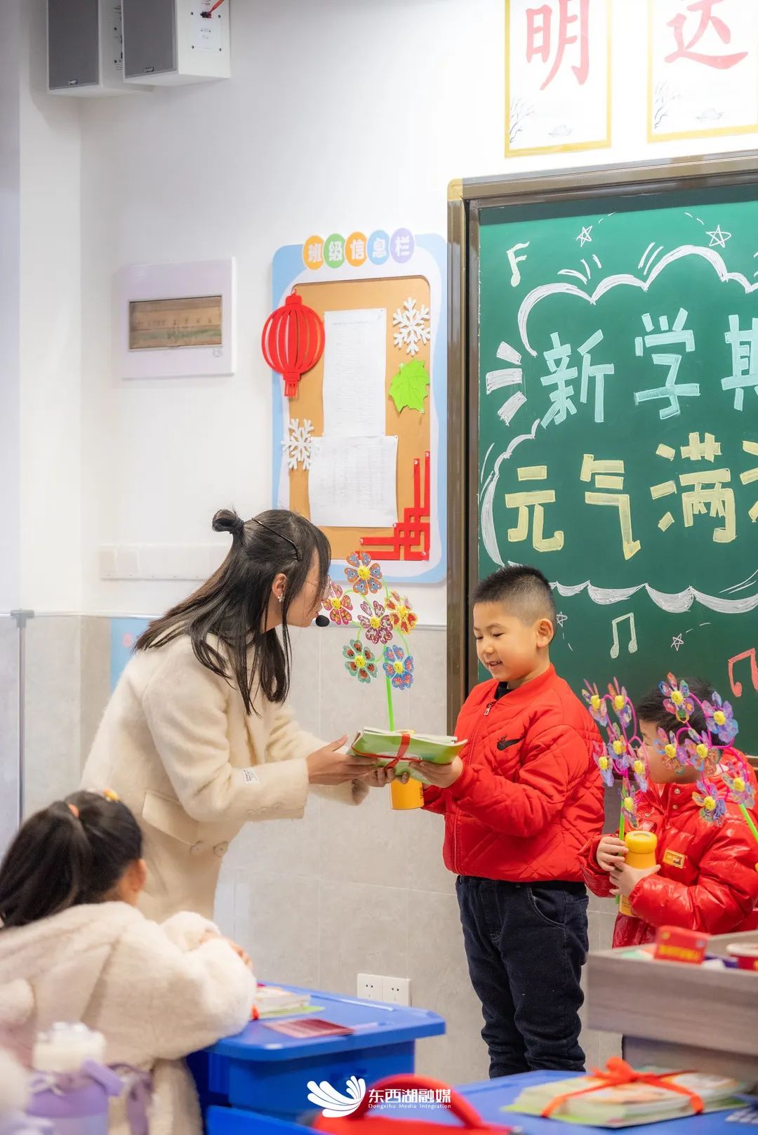 教室讲台上,班主任举行着授书礼,将书本交到孩子们手中,以崭新的面貌开启新学期的第一堂课。