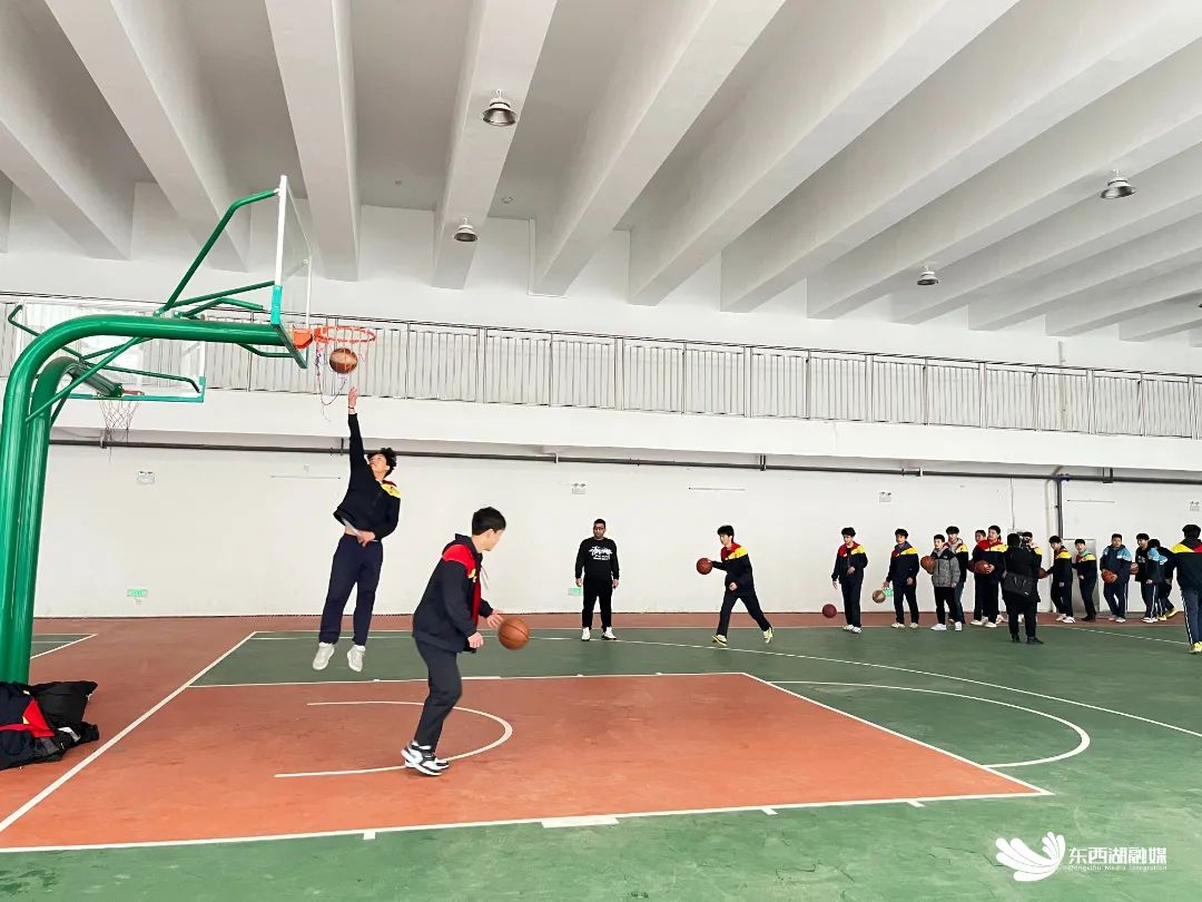 在吴家山第二中学风雨篮球场上,各年级学生利用课间操时间,在老师的指导下进行投篮训练,演练“前空翻”摔跤套路,练出新学期精气神。