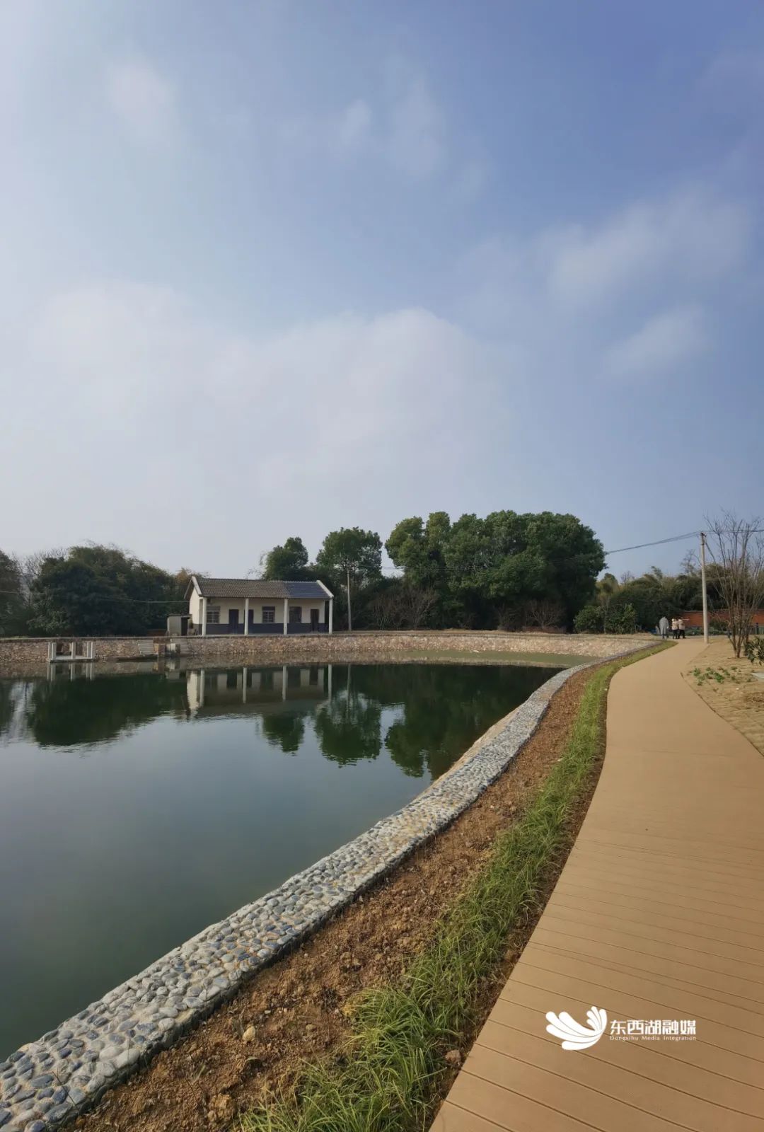 走进天鹅湖社区余刘湾,一口河塘映入眼帘,碧水微澜,清澈透明。河塘周边,还有一条以鹅卵石与木板相结合的木板路,简约的铺装方式与村湾的宁静融为一体。