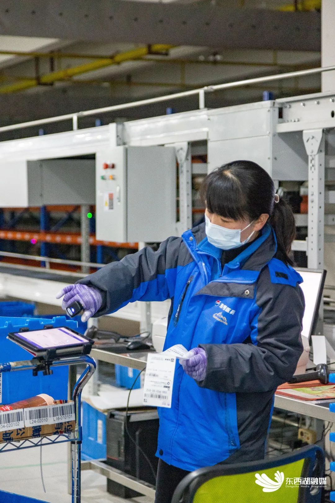 平板电脑推送电商订单信息、显示货架药品摆放位置,理货人员用指环仪扫描周转箱条形码,取出药品放入打包盒,系统自动上传库存信息,打包盒经传送带运至复核区,检查无误后封箱发货,一气呵成。这一整套流程,用时不到一分钟。