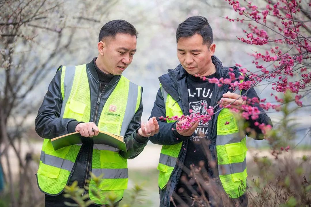 李帅飞(右)与管理员观察梅花长势