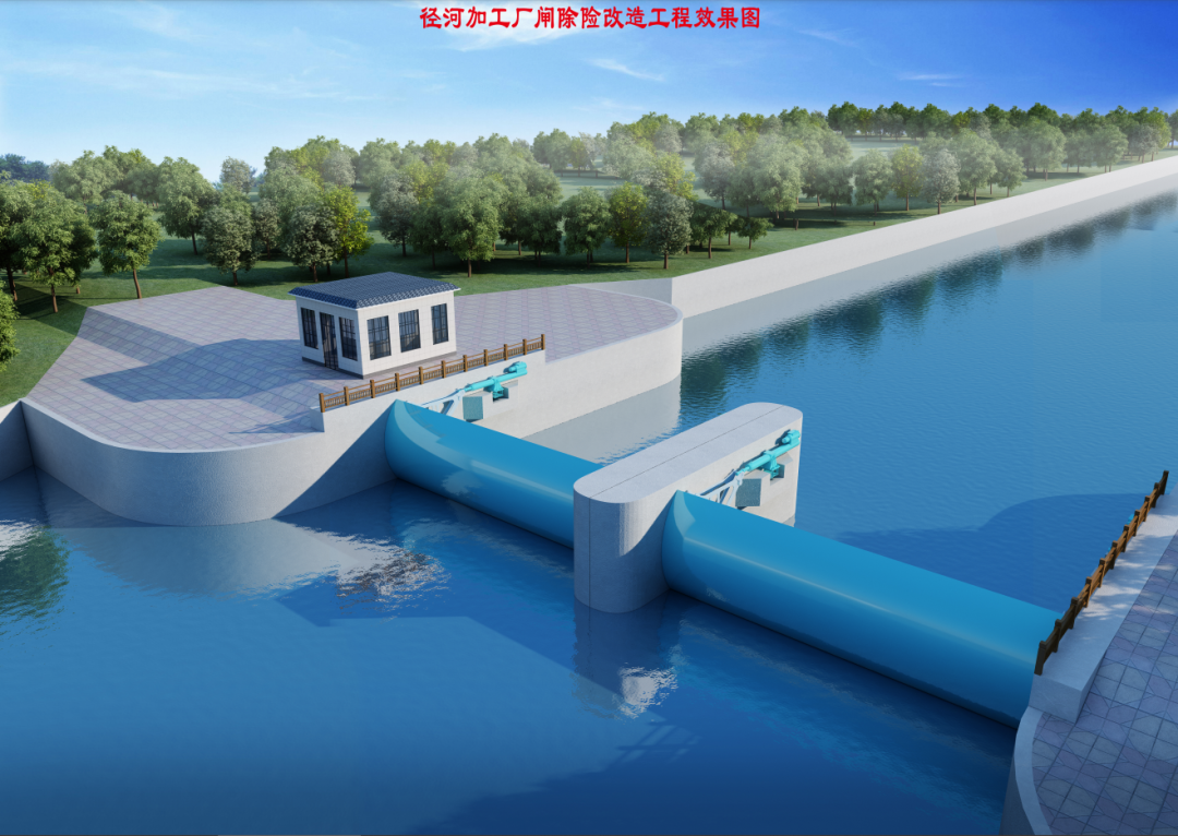 新建的径河加工厂闸选址在原闸上游380米处,农排区设计排涝标准20年一遇、1日暴雨1日排完,城排区设计排涝标准30年一遇、1日暴雨1日排完。