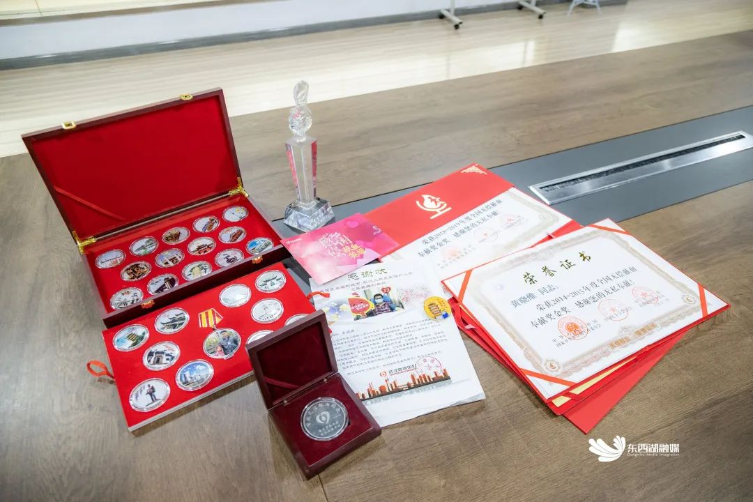 全国无偿献血奉献奖金奖、百次无偿献血纪念章、24枚江城献血纪章......荣誉证书、奖杯奖牌,将一个帆布袋塞得满满当当,其中厚厚的一沓无偿献血证尤为显眼。这些“沉甸甸的荣誉”,拎起来有10余斤重。