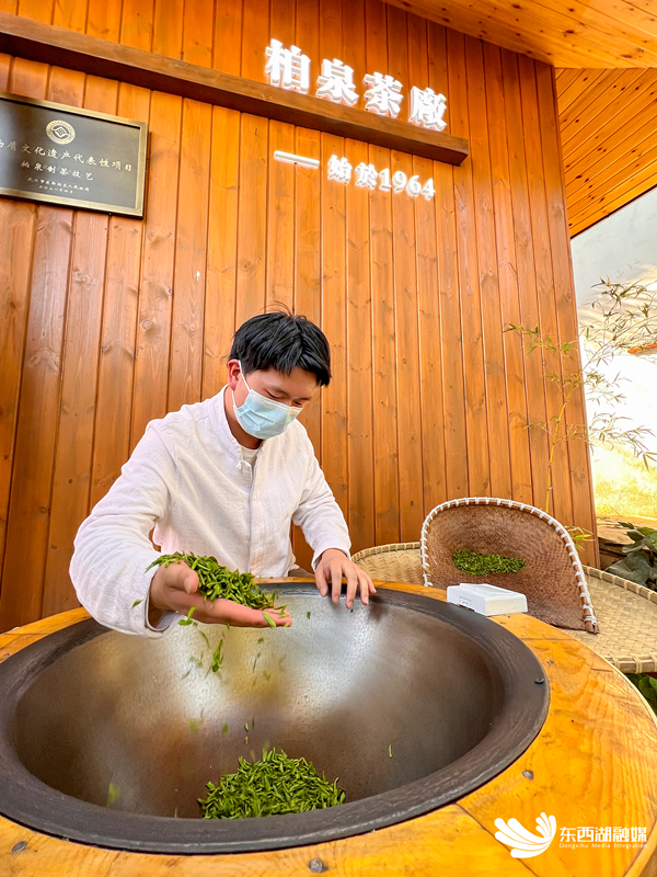 “这是今天上午采的新茶,4斤3两鲜叶才炒出1斤茶叶。”炒茶师霍俊宝在锅内不断变换手法,让鲜叶水分快速蒸发,阻止茶叶发酵,保留其精华香气,又不破坏其形,作为手工制茶的第一个步骤,杀青起到了至关重要的作用。
