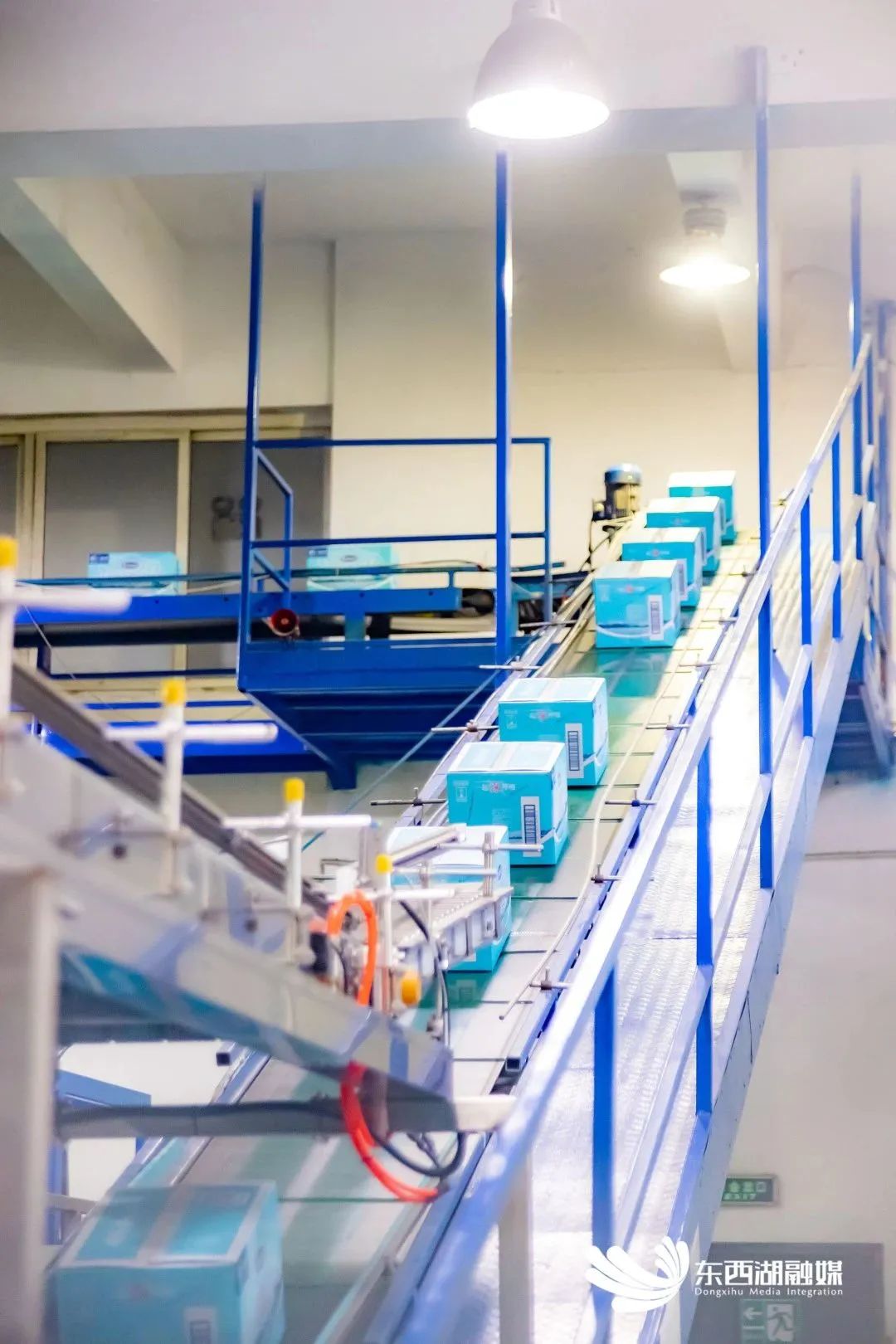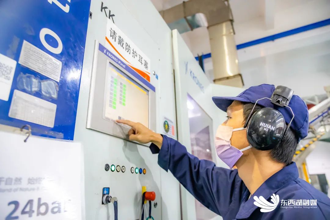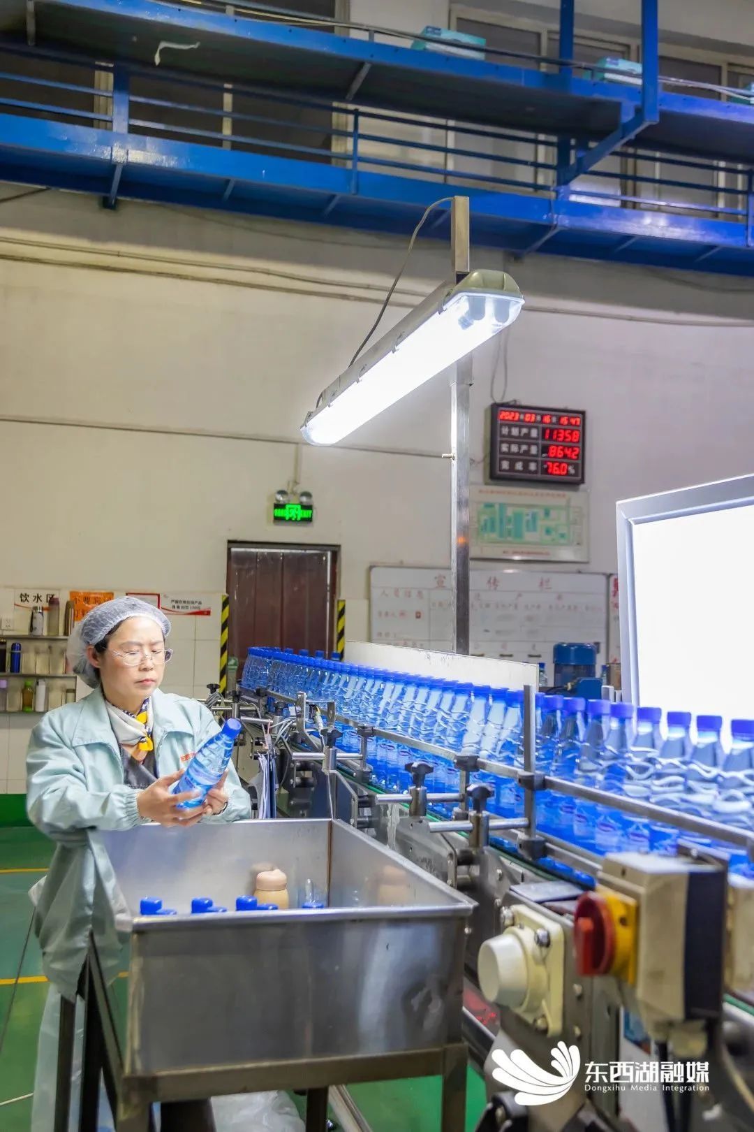 在水汽生产线上,记者看到从水质检测、灌装、高速裹膜再到装箱完成,各环节紧密相连,环环相扣,全流程仅需几名工作人员进行质检。