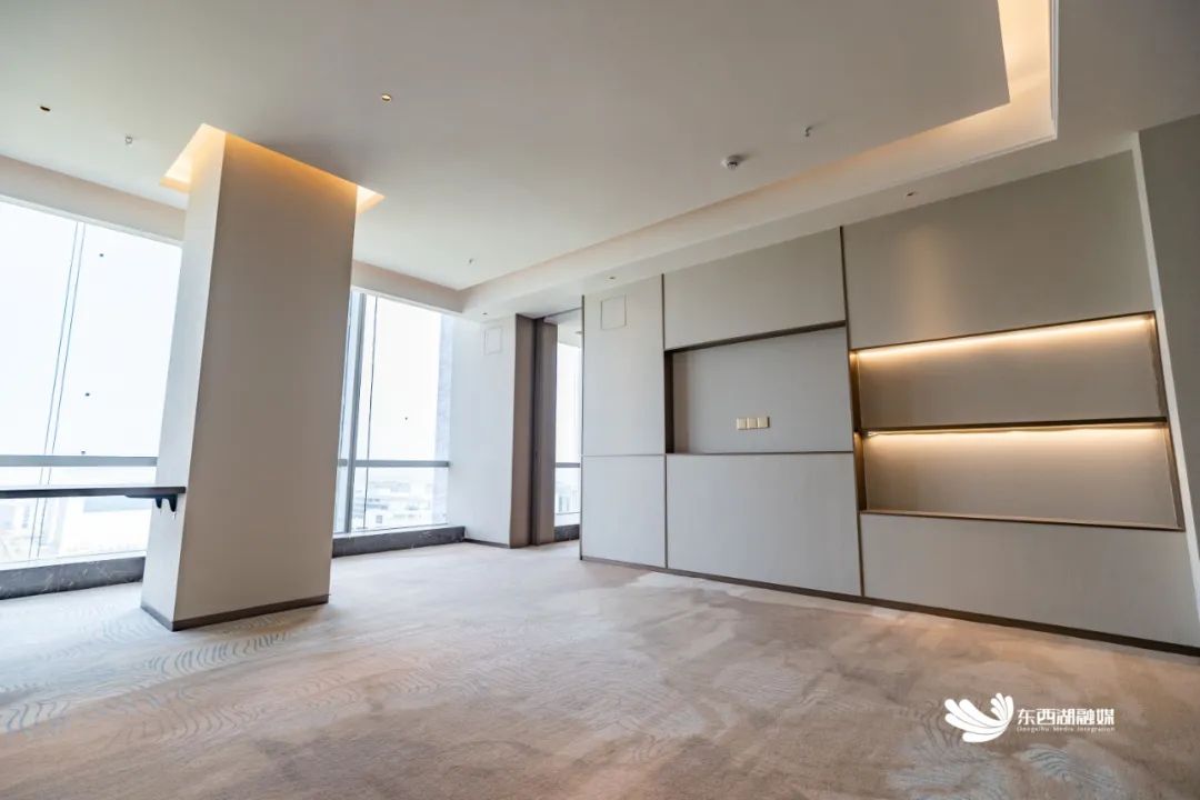 记者在项目现场看到,两栋纯玻璃幕墙的裙楼建筑,颇具科技感,目前大楼外立面已全部完工,工人们正全力冲刺室内装修收尾工作。
