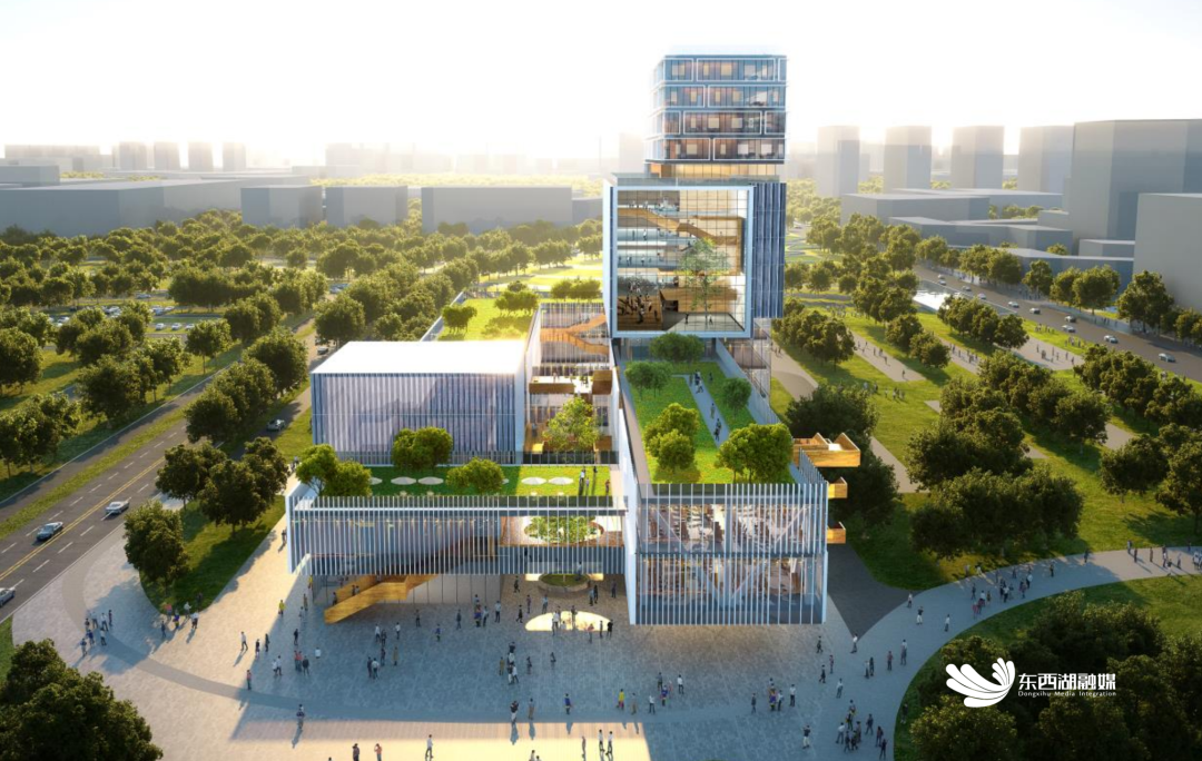 一期项目整体分为西区和东区两部分,西区包括办公、商业街区,东区包括酒店、会议中心,总建筑面积近10万平方米。