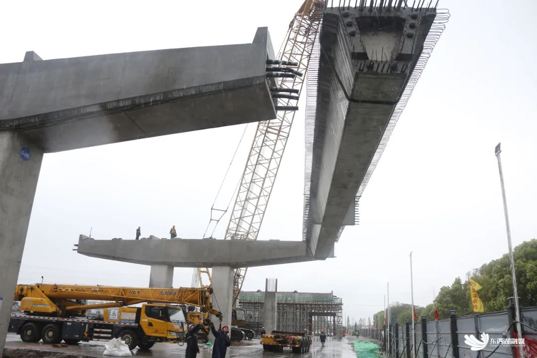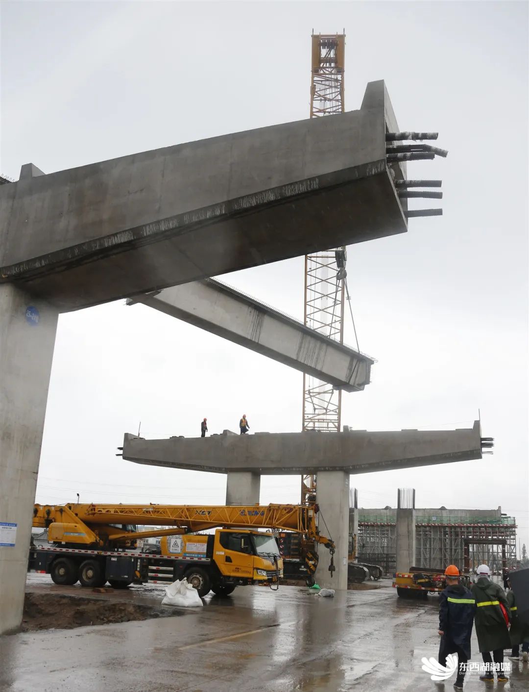 此次架设的首片箱梁为预制连续小箱梁,梁高1.6米,宽2.3米,重106吨,现场采用履带吊与汽车吊共同架设的方式配合安装。