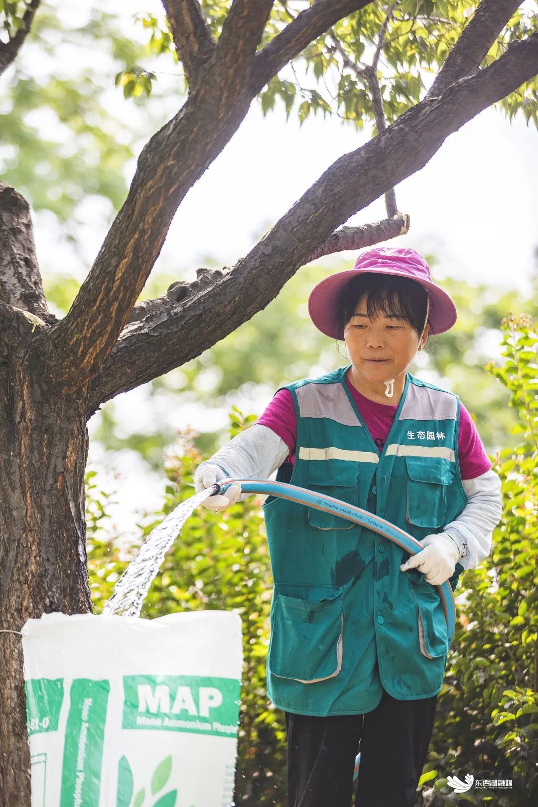每天5点就到公园了,所有乔木、灌木上挂着加起来有五百多个水袋,需要挨个检查里面缺不缺水。
