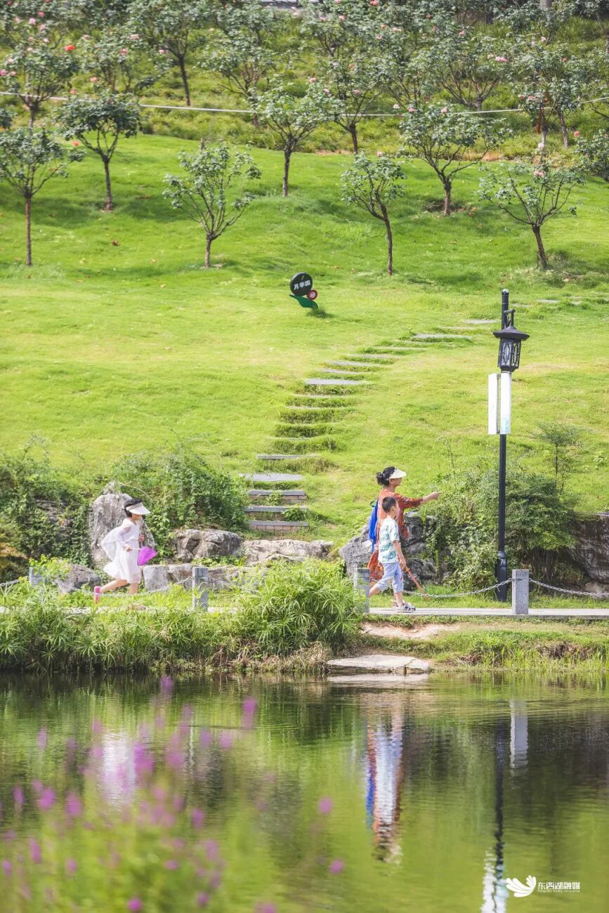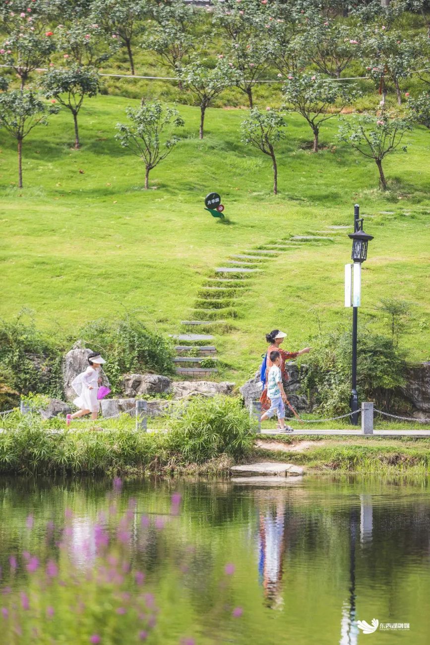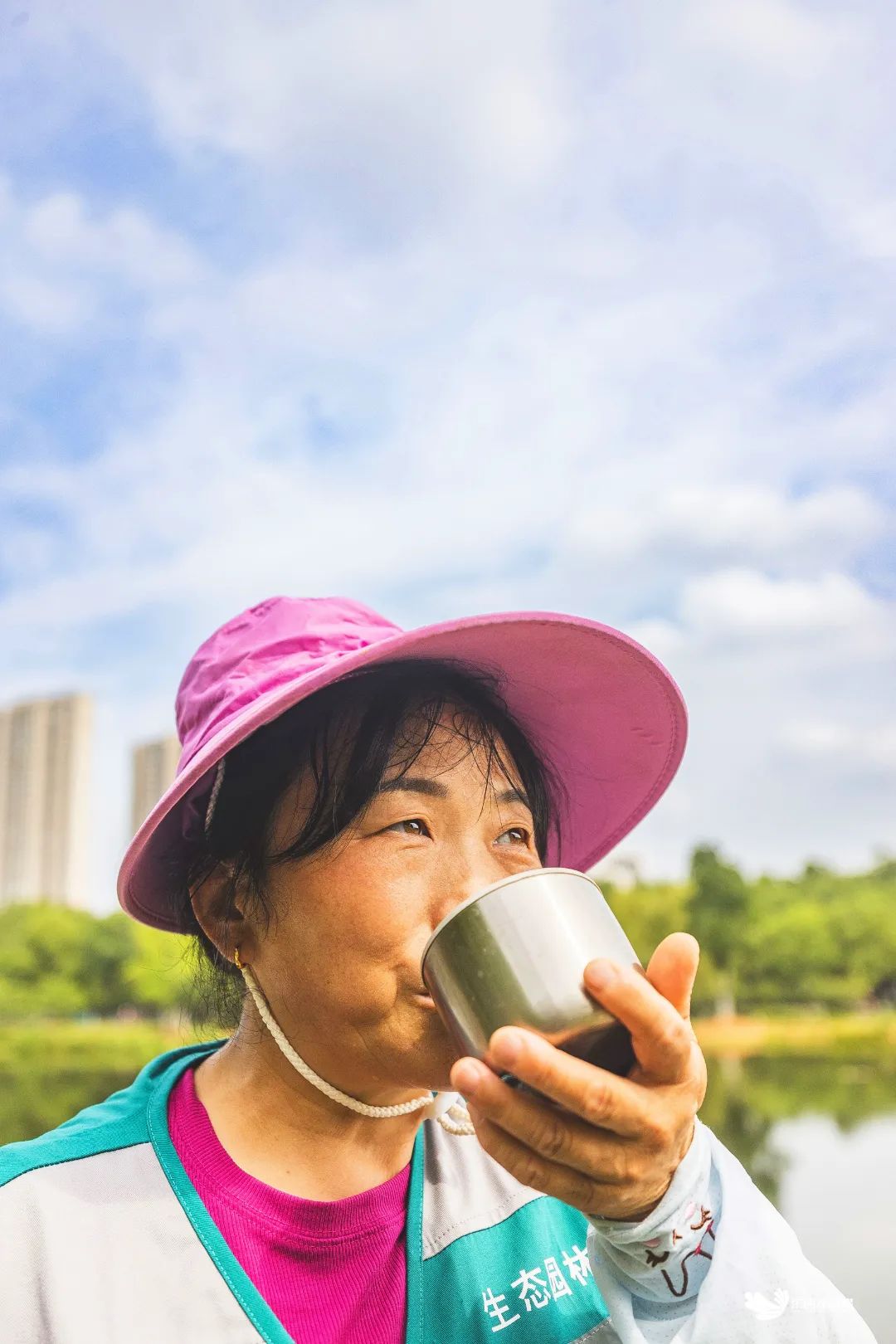 曾钢情自备的是一个1升的水壶,因为步行量比较大,她每天最少喝2壶。曾钢情一边休息,一边欣赏公园的美景。
