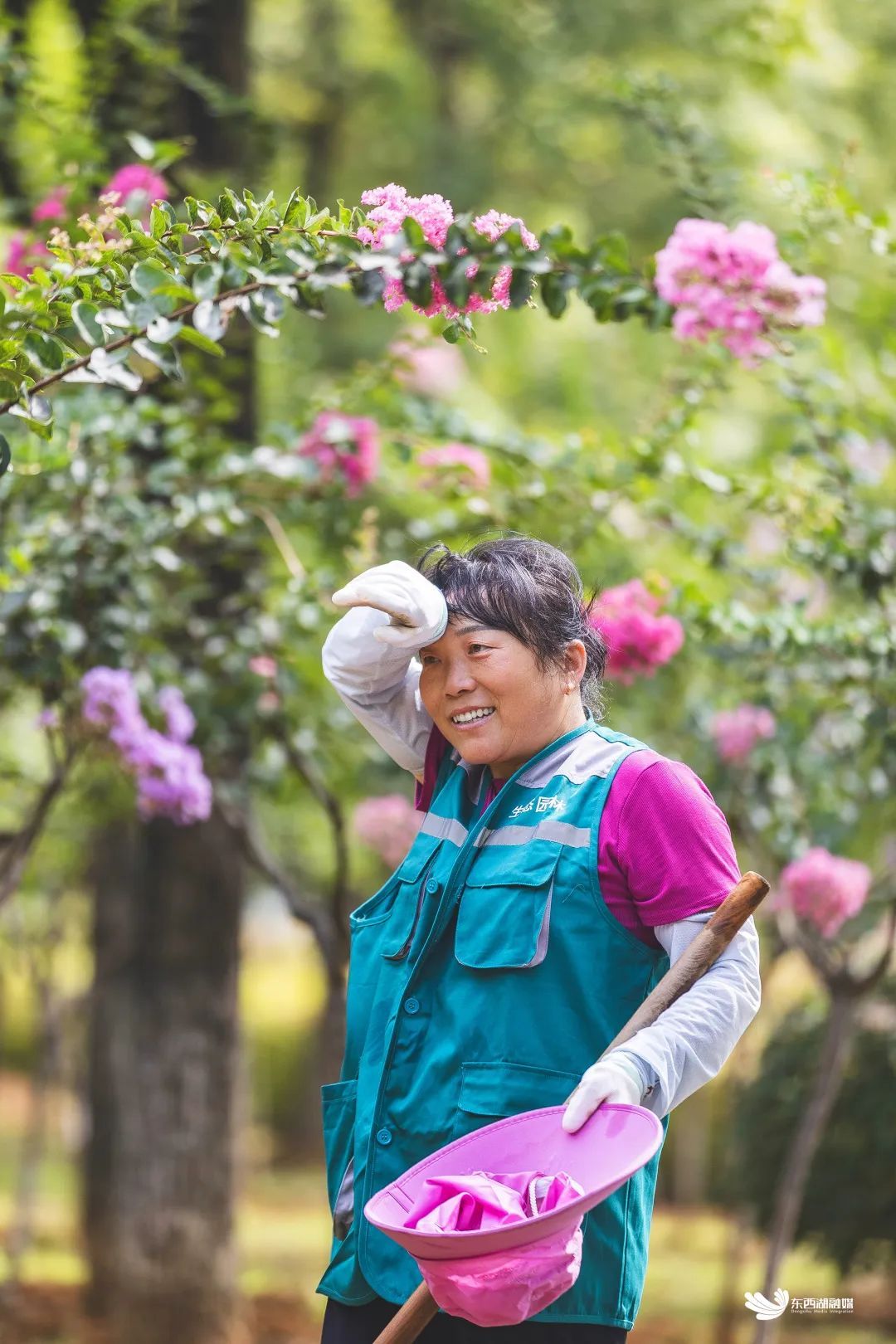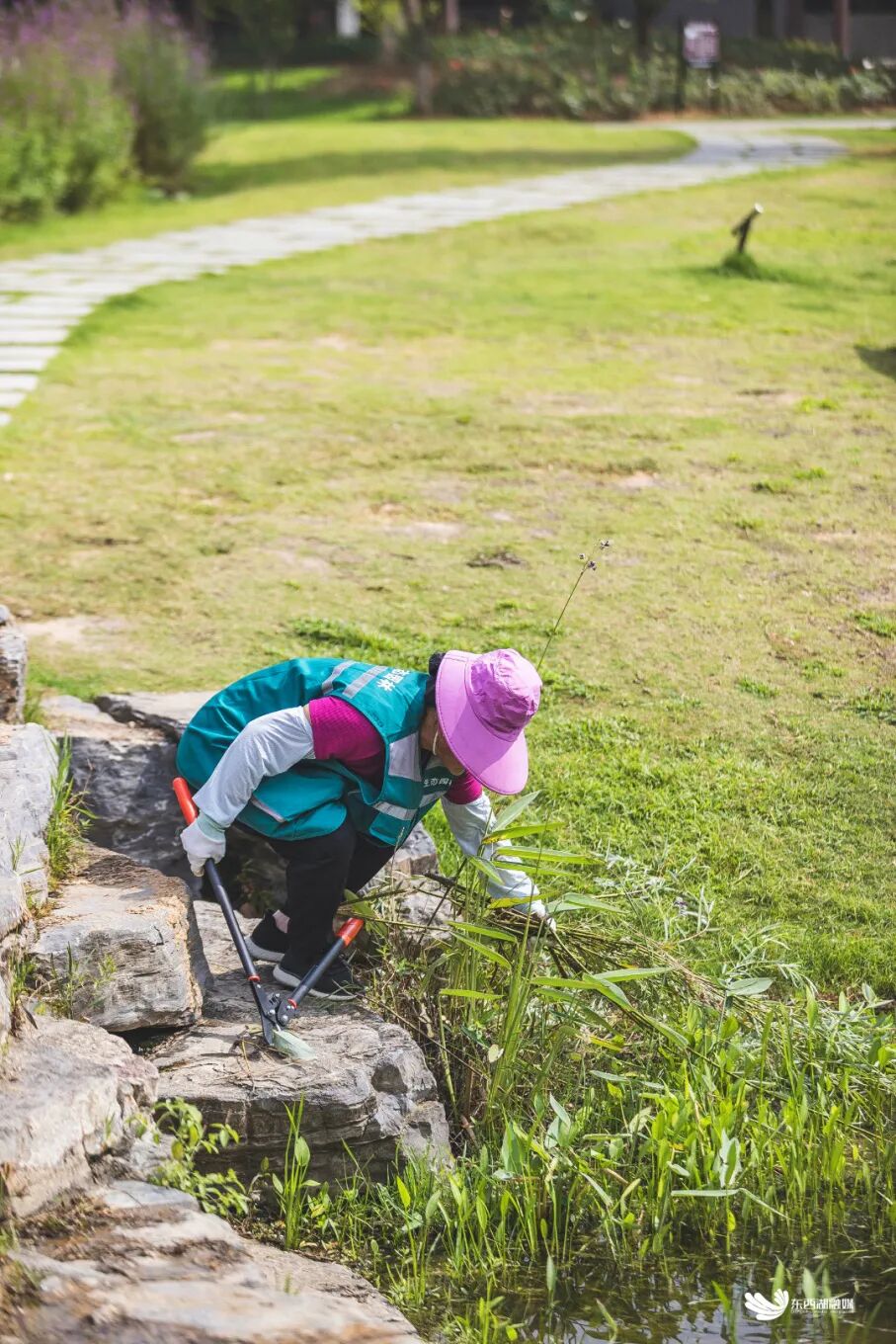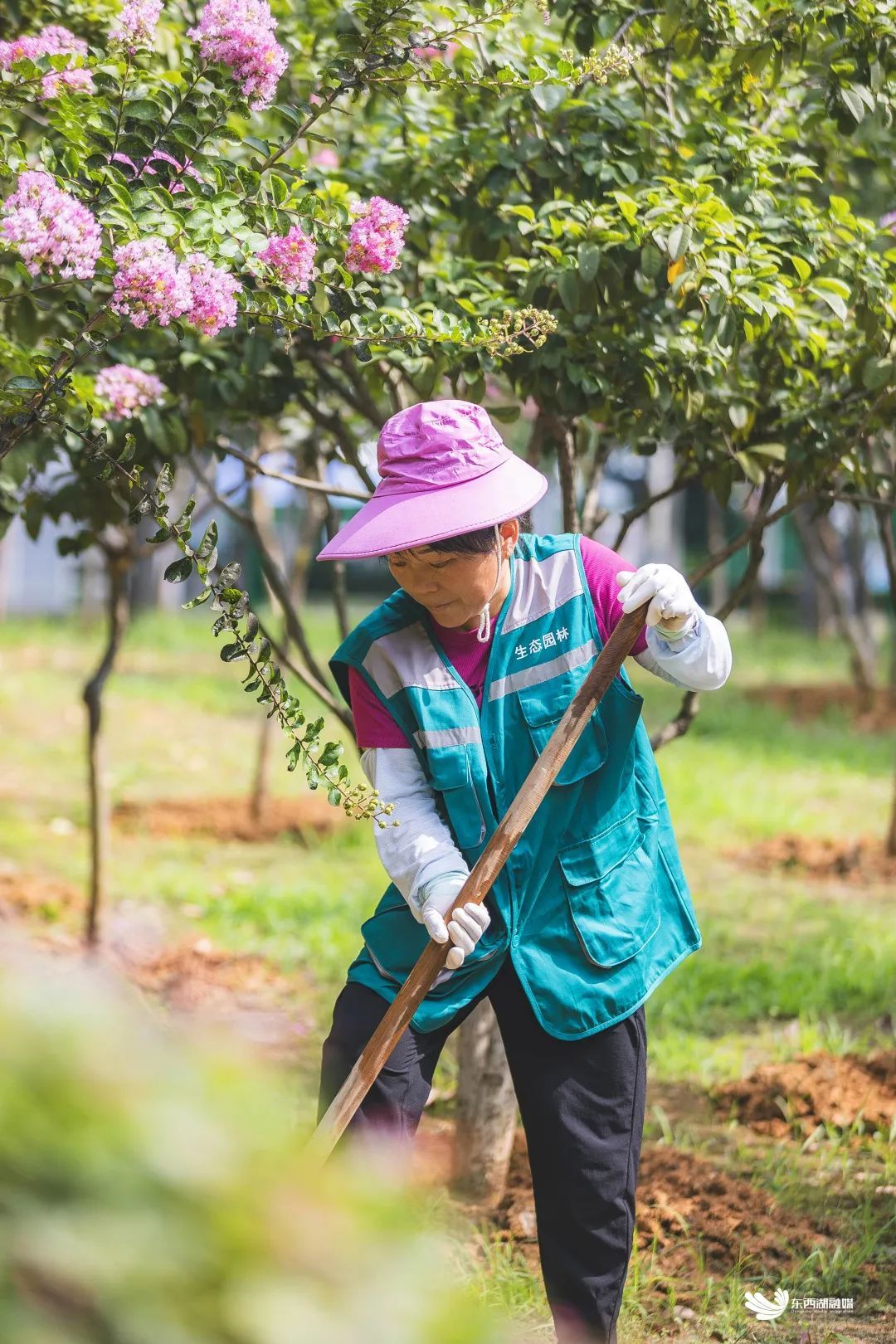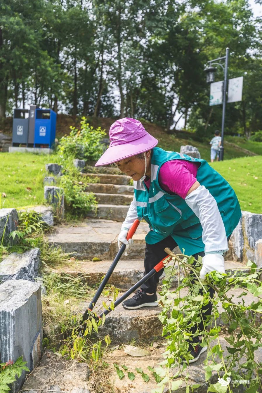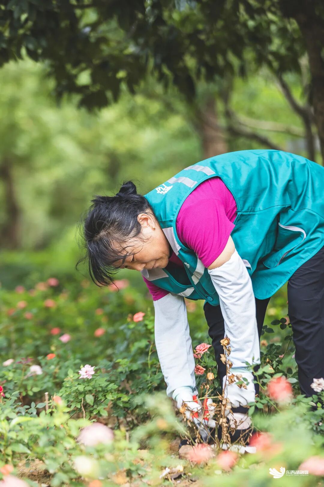 “曾姐,公园北入口处的钻石月季发现了枯叶,麻烦你过来指导一下。”接到队友的求助电话,曾钢情带着园林绿化日常修剪的美容工具来到钻石月季园,开始剪枝、除草。曾钢情一边除草,一边告诉队友,杂草与绿化苗木争水争肥,要按照“除草、除小、除早”原则进行,切勿碰伤苗木根系。