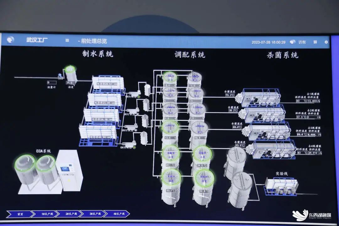 设备智能巡检,管理全程在线;对生产指标进行实时监控,异常情况“自主刹车”;车间的生产效率、灌装产量、入库数量等数据信息不停更新,在数字化面板上一目了然……