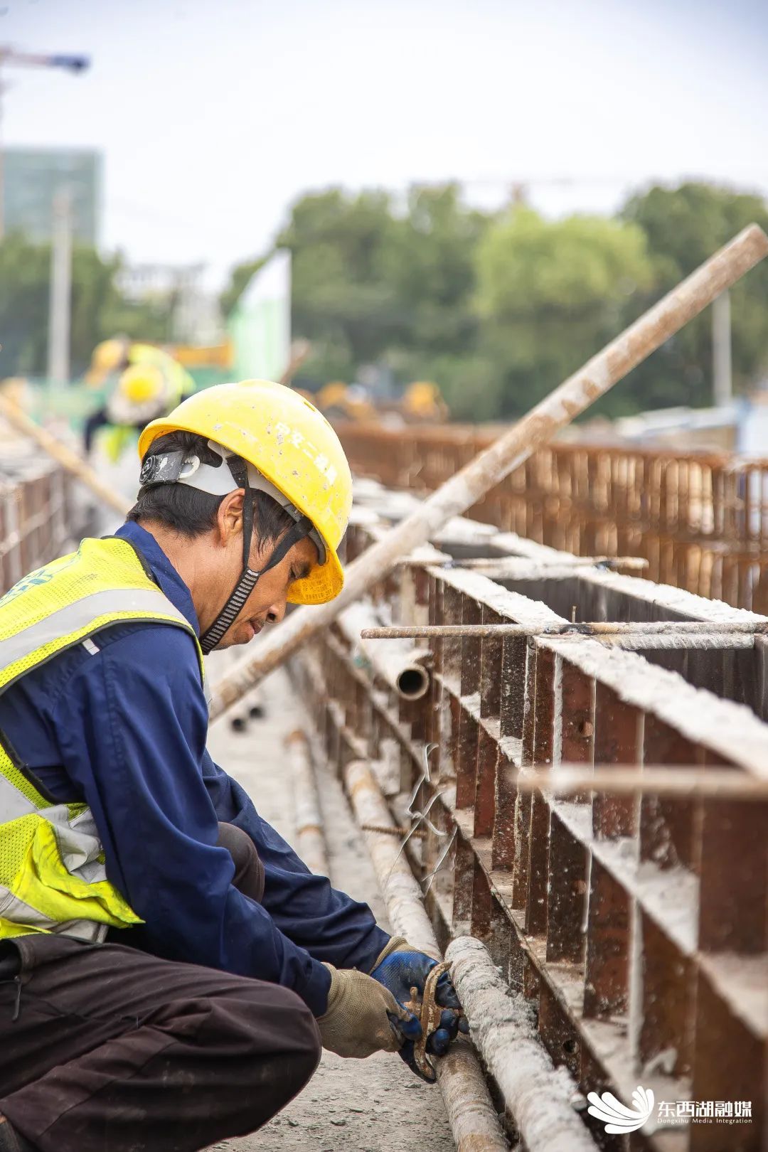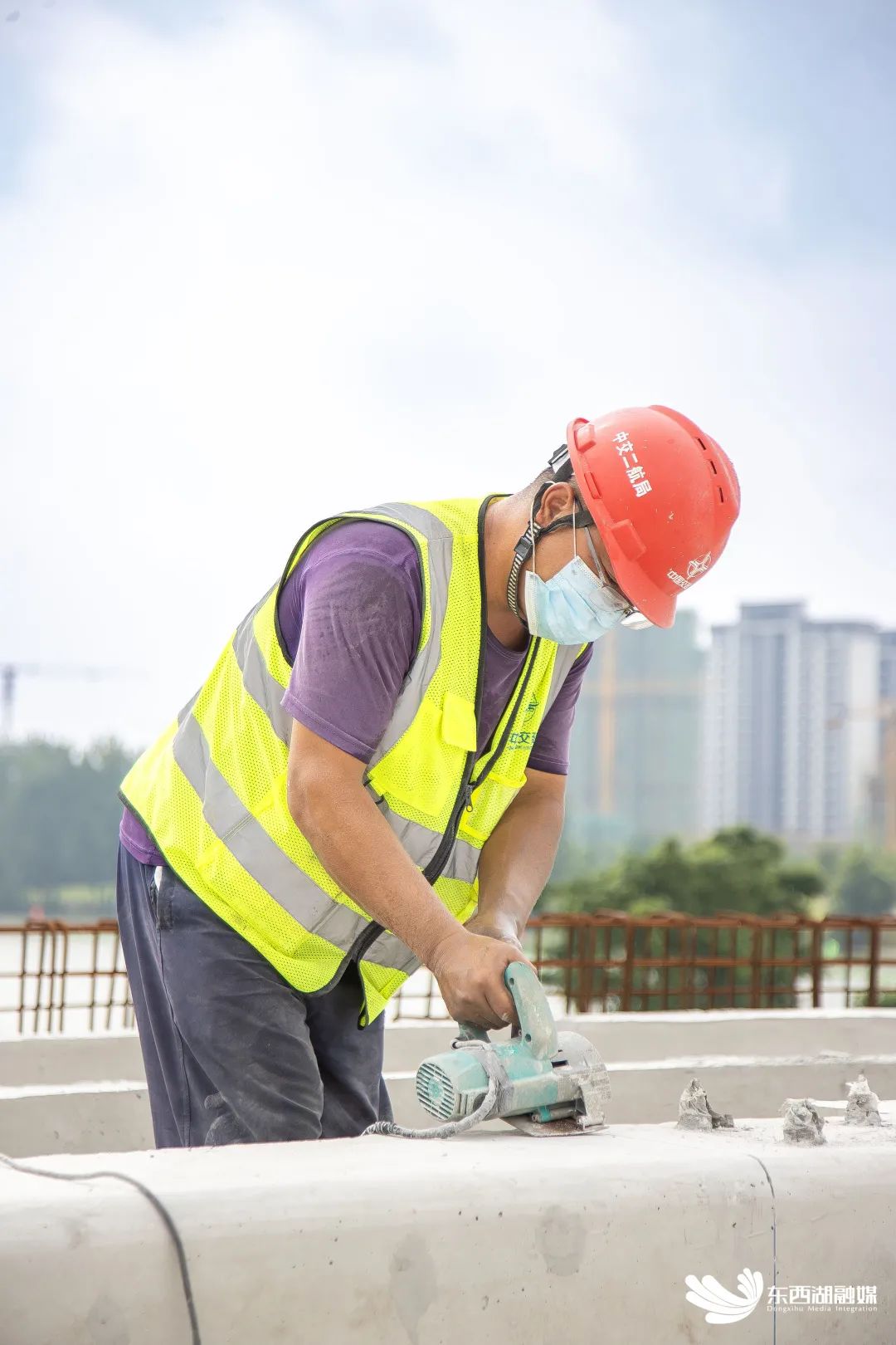 8月8日,东西湖区创谷路跨径河桥及大湖口闸工程项目建设现场,汽车吊、挖掘机等大型施工设备正在进行模具吊装、平土碾压等施工作业,20余名工人头顶烈日坚守岗位,焊接声、切割声、锤打声交织起伏,一派热火朝天的施工场面。