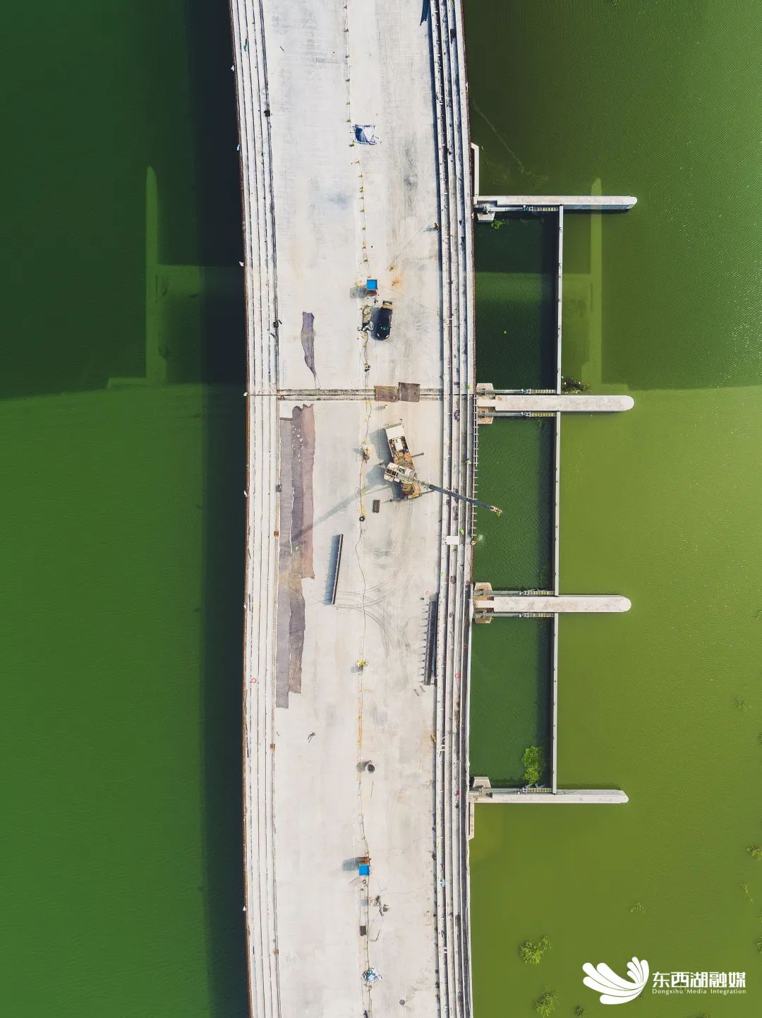 “由于项目工程处在三河交汇处,施工难度较大,我们抢在汛期前围堰筑桥,现在桥梁主体结构已经全部完工。”施工方中交第二航务工程局有限公司项目现场负责人介绍,创谷路跨径河桥及大湖口闸项目,主要建设1座跨河桥梁、1座水闸以及两岸的连接道路,目前正在进行桥面护栏和两岸接线施工作业。