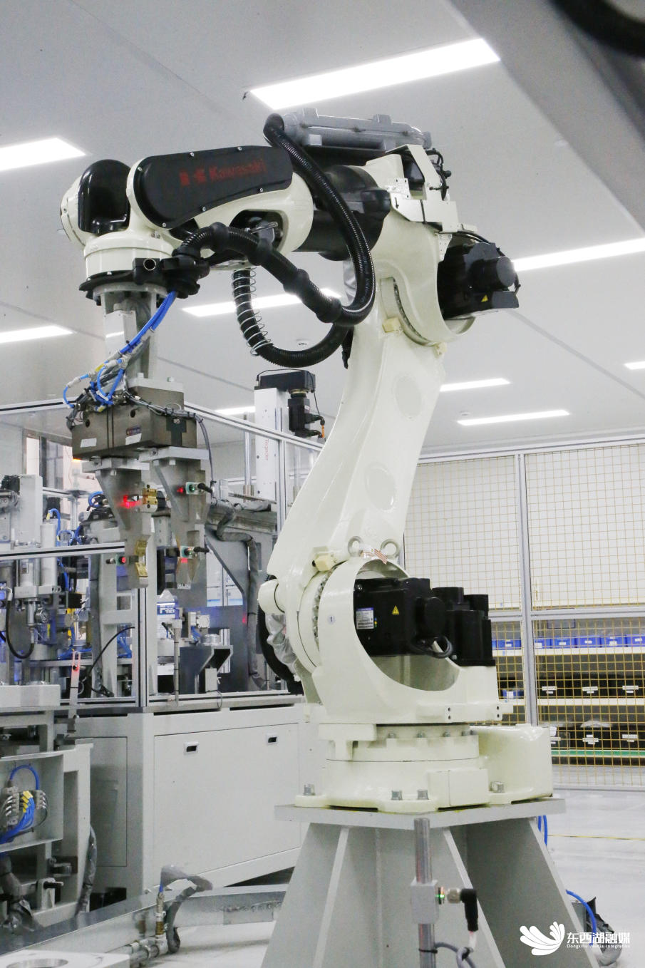 在电机生产车间里,数十台自动化生产设备正在紧张地运行,到处都是工业机械臂,整个电机电控二合一自动装配线仅需几名操作员站在旁边监管。像这样的生产线,园内共有6条。