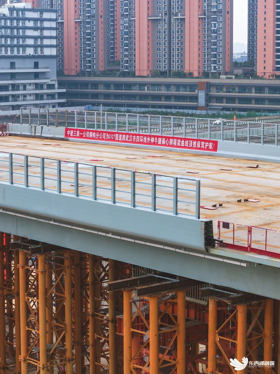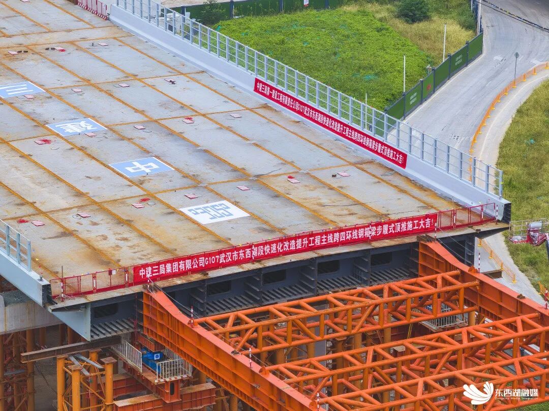 8月26日上午10时,G107东西湖段快速化改造提升工程(二标段)跨武汉四环线高架桥钢箱梁正式进入顶推施工阶段。