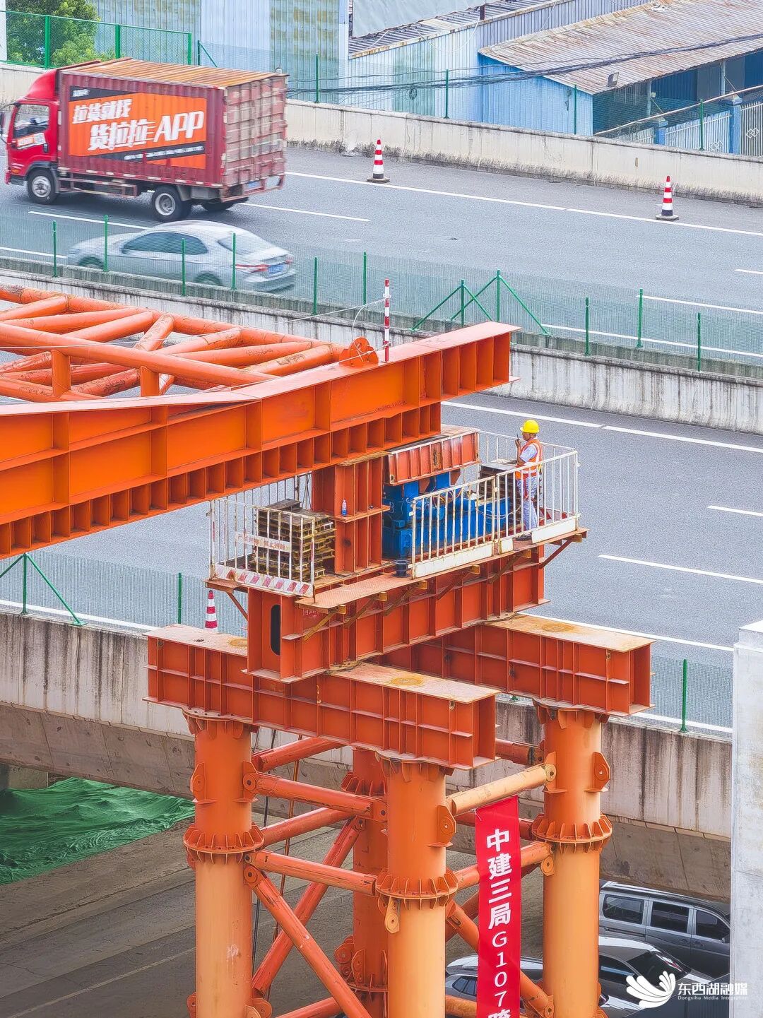 四环线高速车流量大,致险因素多,交通组织安全控制要求高。为确保钢箱梁精准高效地“走”完78.5米路程并精准落梁,项目设置12台1200吨智能三维顶推设备作为梁体滑移动力来源。