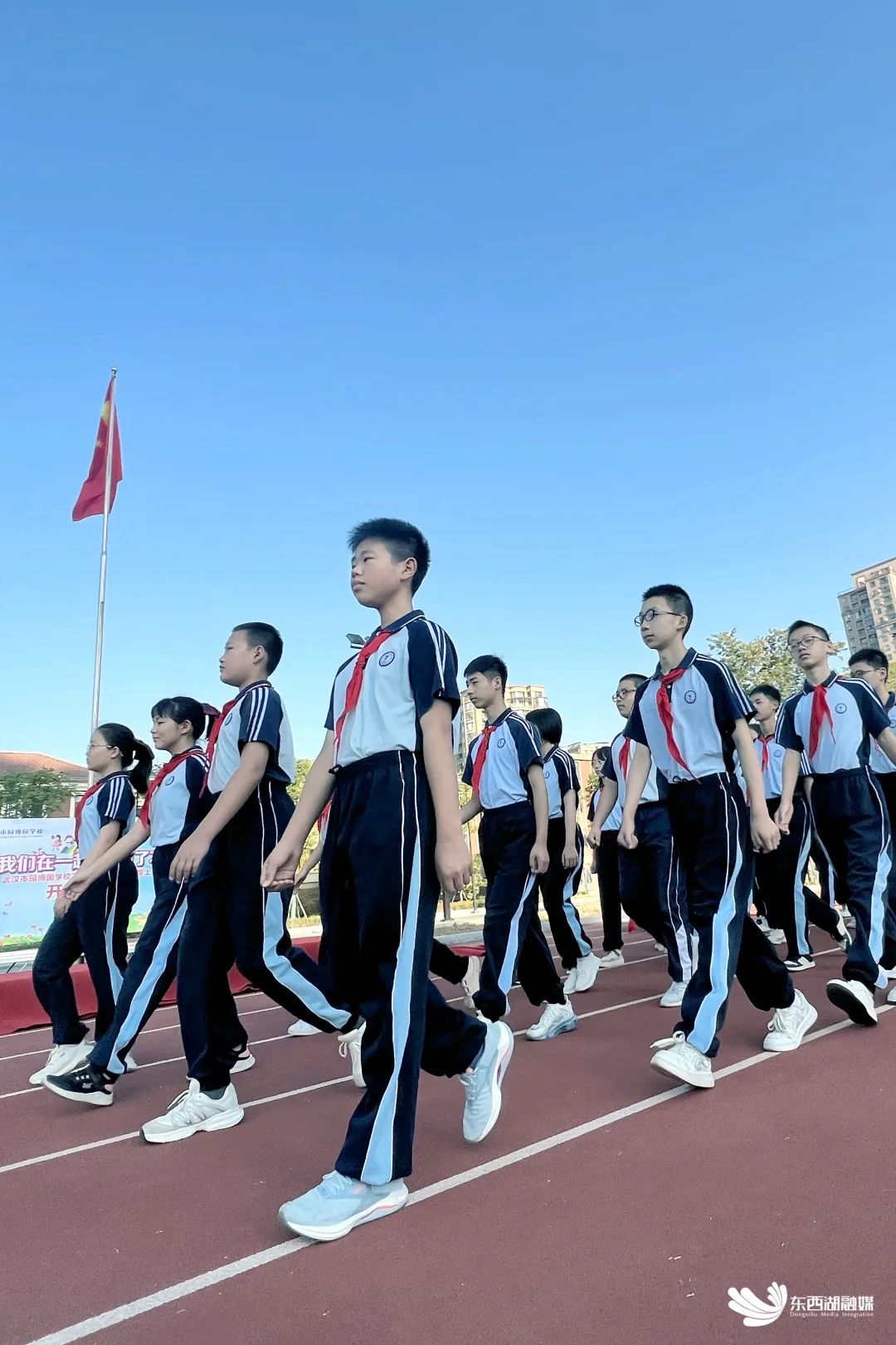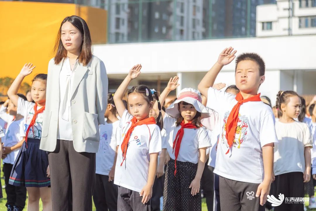 园博园学校操场上,少先队员一字排开,敲击鼓点,同学们应声集结。开学典礼在庄严的升旗仪式中拉开序幕。迎着朝阳,崭新的五星红旗冉冉升起。同学们昂首挺胸,集体宣誓:“勤奋学习志存高远,顽强拼搏积极作为。”