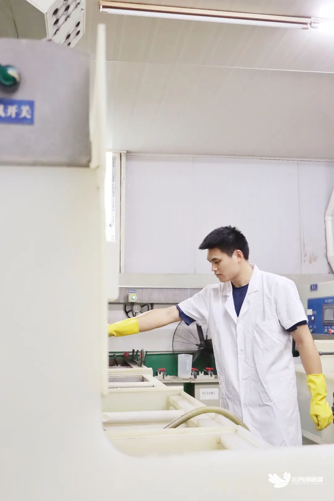 电抛、去膜、中和、氧化……在菲尼克表面处理部,工作人员正在对客户送来的铝制车标进行表面处理,在达到客户最终想要的效果后,这个车标将成为客户大量生产所依靠的样本。