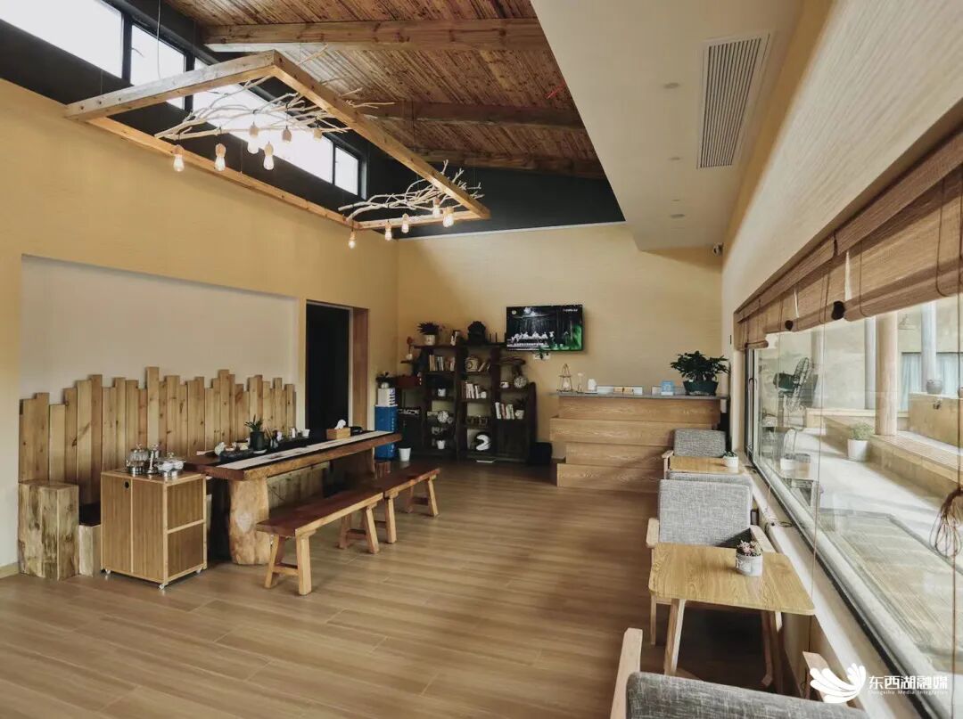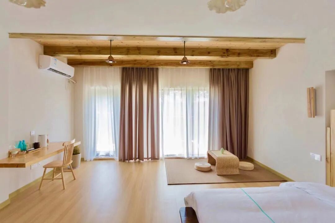 房间内自然的原木色家居,暖黄色灯光,让人感觉温馨又舒适。私享小院里摆老式竹茶台,大片的落地窗外是彩叶的乌桕银杏,坐在榻榻米前喝杯茶,好风景就在眼前流转。