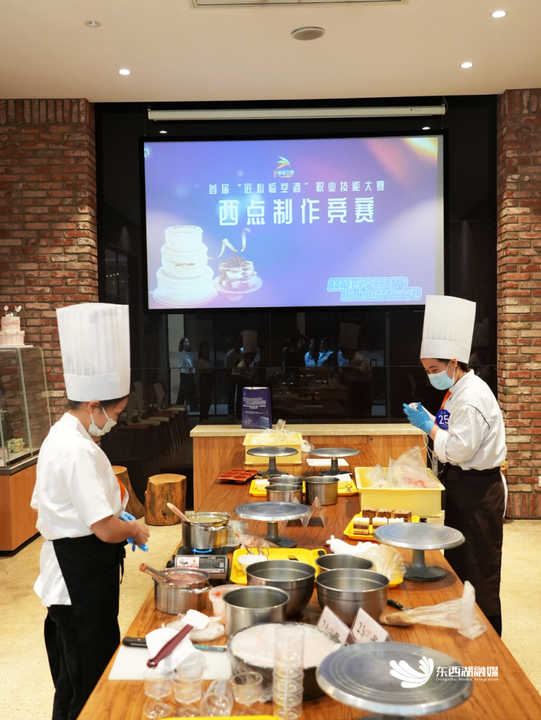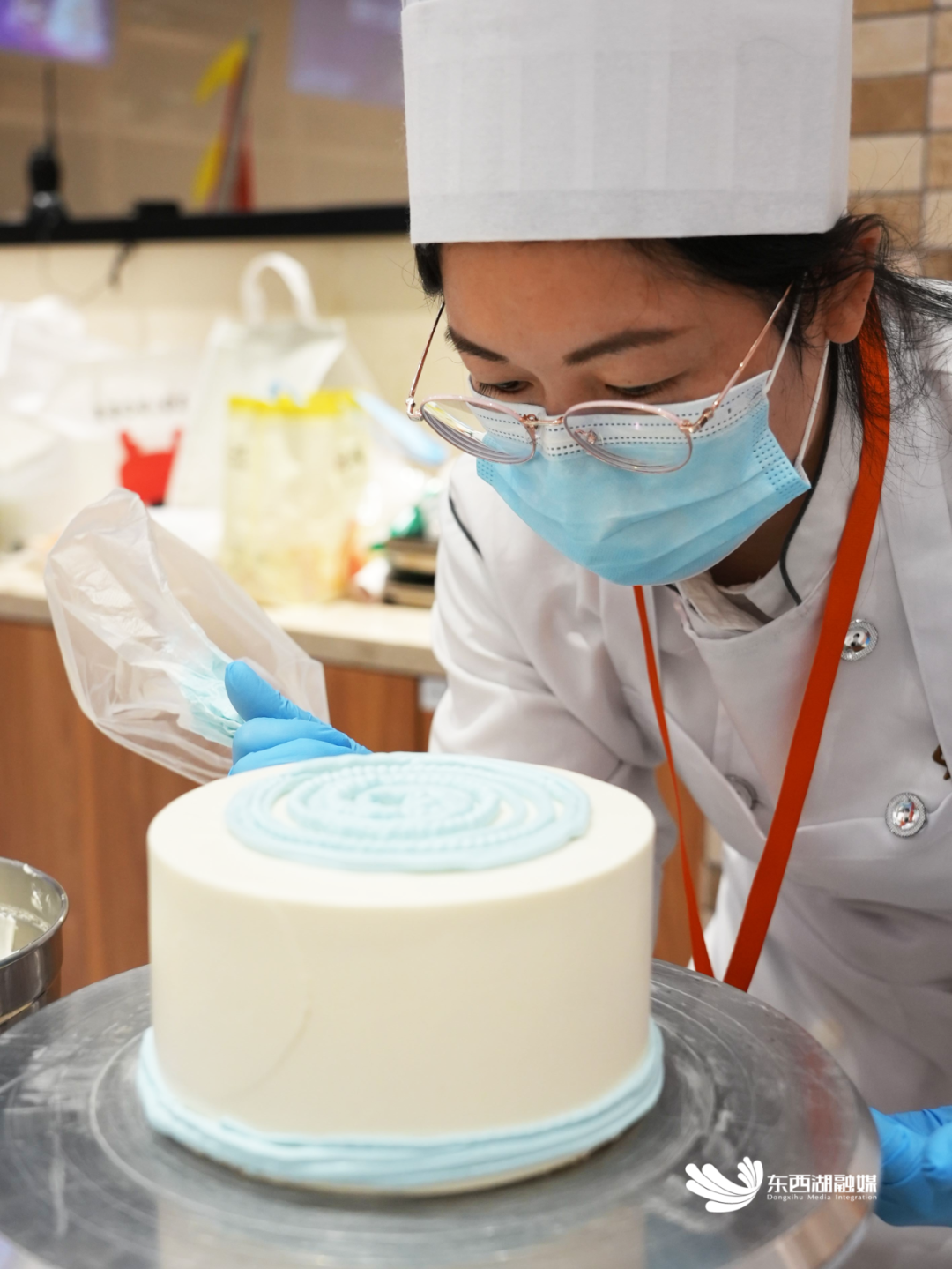 装饰主题蛋糕制作要求有创意并彰显临空港特点。比赛现场,选手作品让人眼花缭乱——巧克力做成的芯片、金色勾勒出的电阻和导线、糖衣做成的铜线,“光芯网”在蛋糕上完美呈现;两个蛋糕中间以“饼干桥”实现“硬联通”,象征临空港融合发展新格局;黑白奶油做成的山、抹茶粉装点了山上的绿、蓝白奶油做成的水,模拟出登临“吴家山”眺望临空新城的山水画卷。
